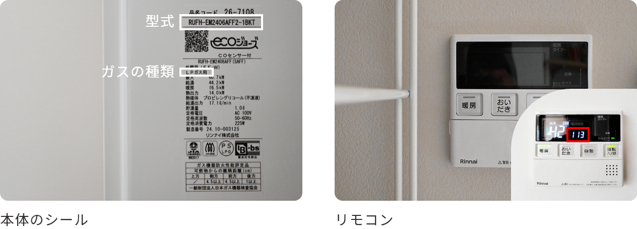 熱源に不具合が生じた時に、エラーコードから不具合の原因を調べることもできるため、エラーが表示されましたら(リモコンに表示) 本体に貼っているシールに記載されている、型式番号とエラーコードをお電話にてお伝えください。
