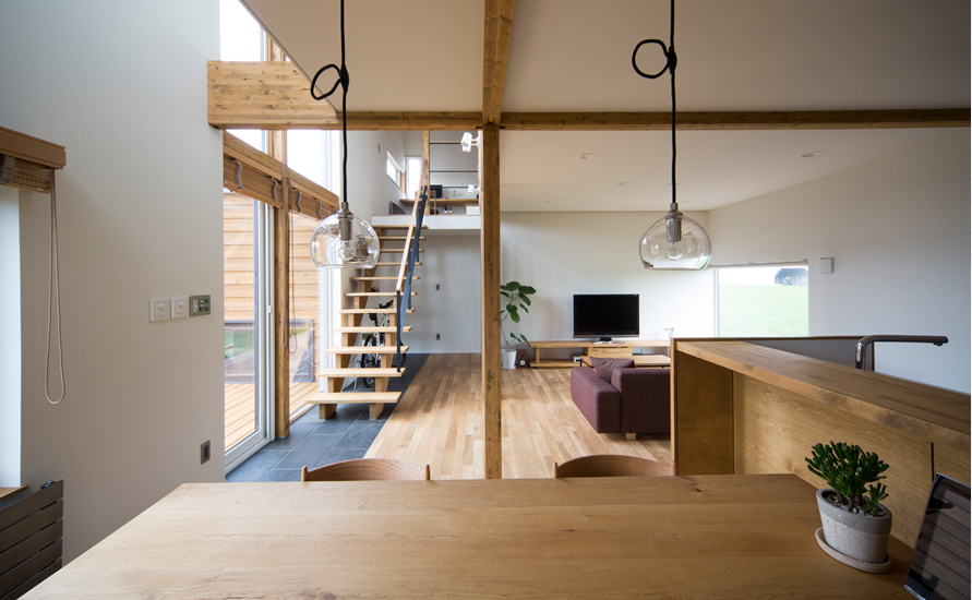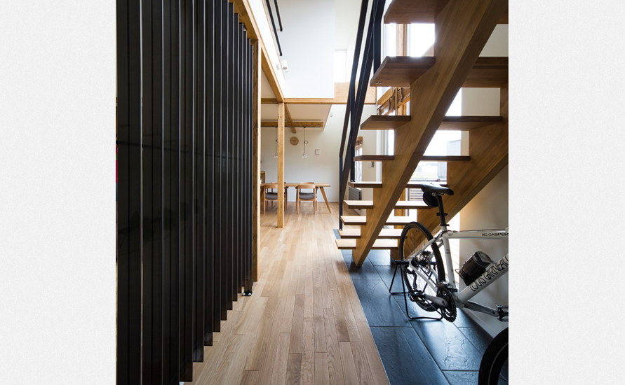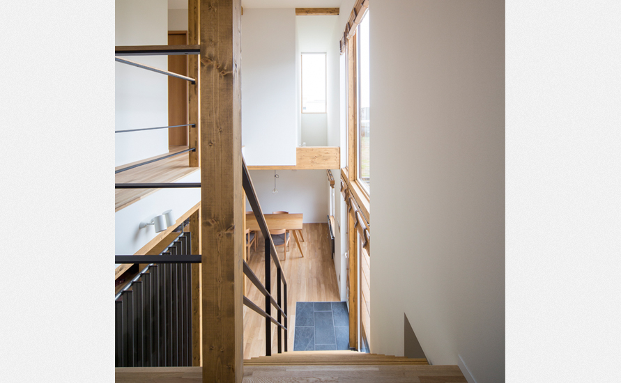 階段上にあるフリースペースと1階のダイニングの程よい関係性を作るため、
