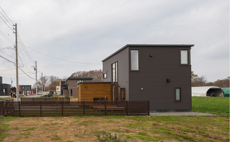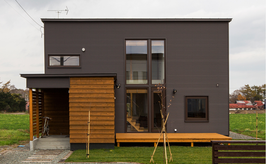L型の建物で囲うように広いウッドデッキを設置し、家の内と外との関係性を強めている。