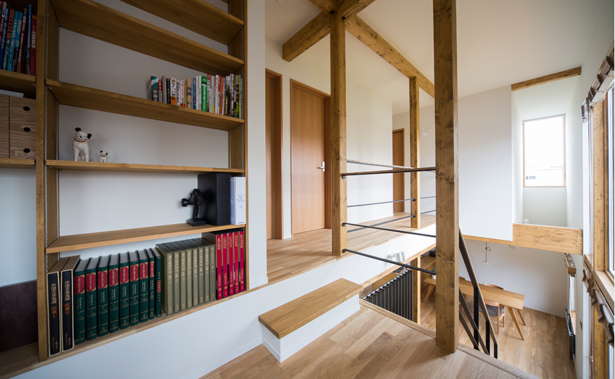 フリースペースは2階床レベルよりも階段2段分低くし、