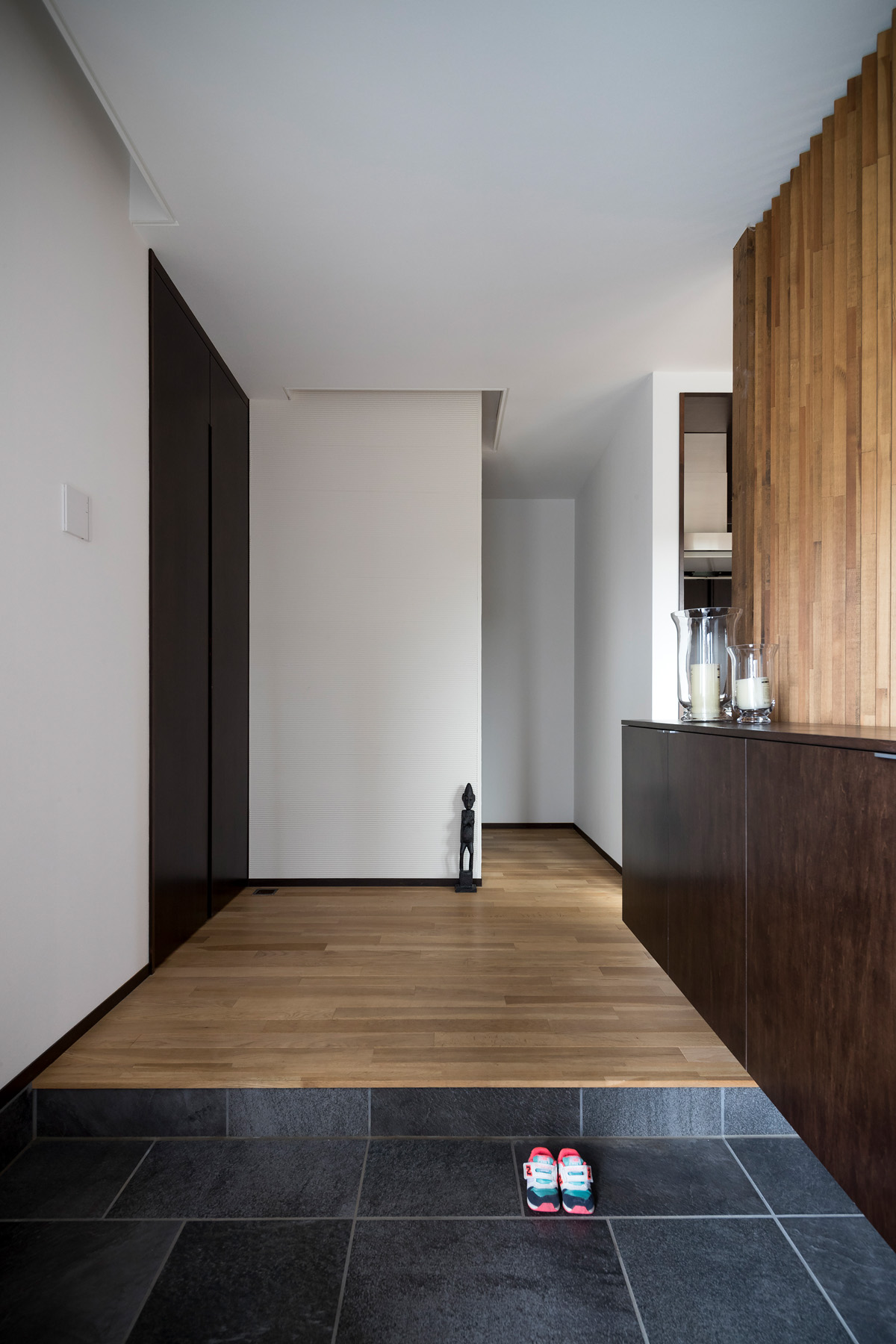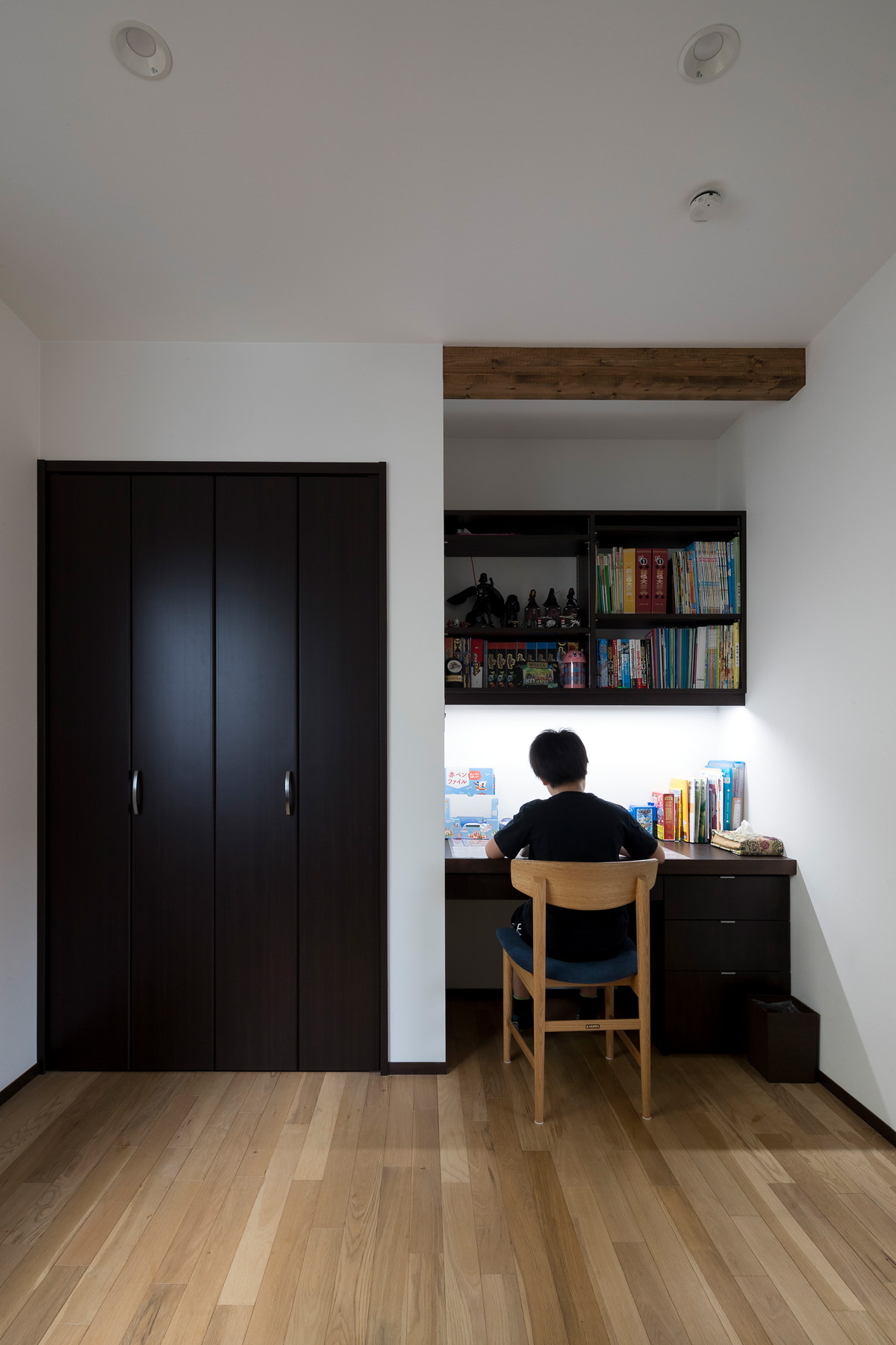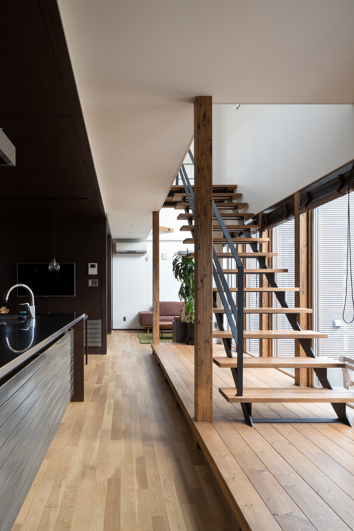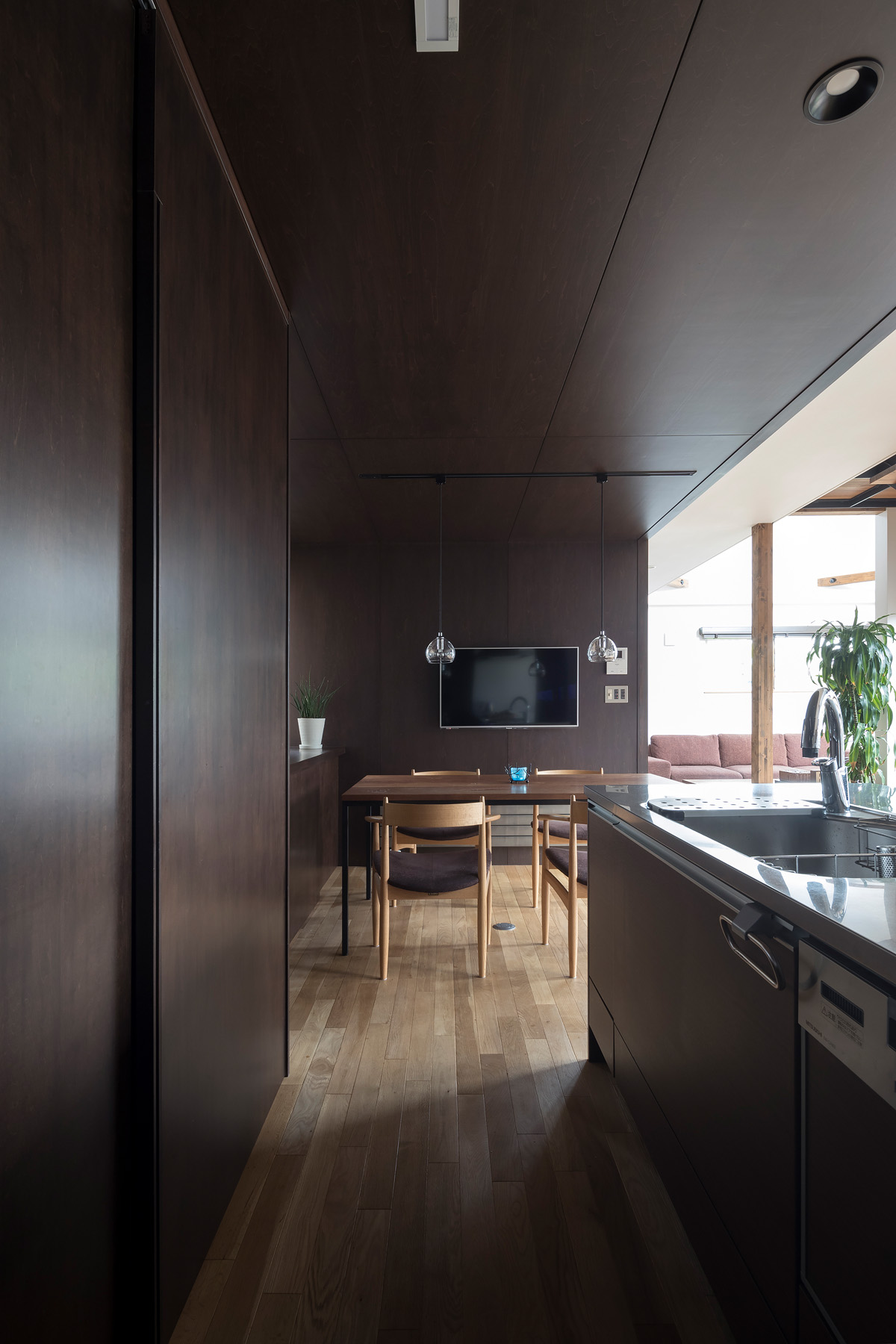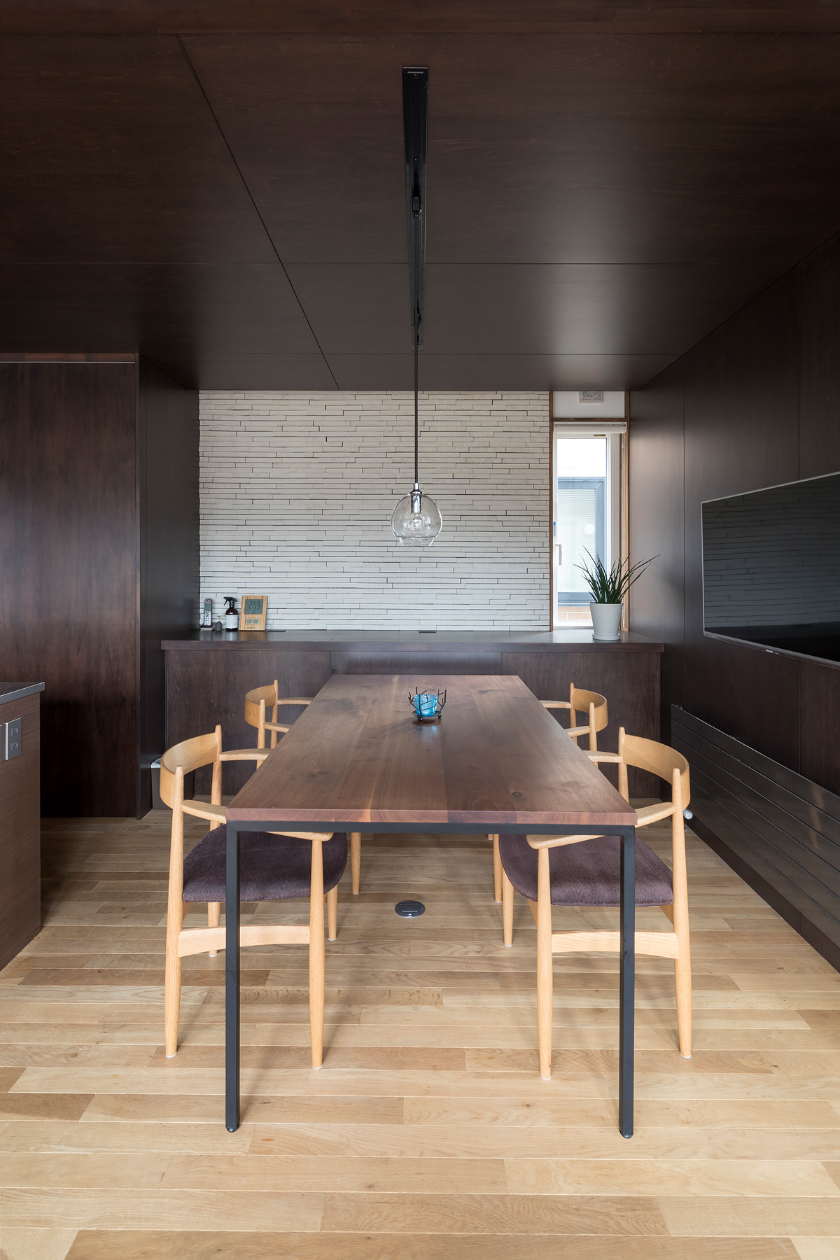 - 勇払の住宅街に立つコートテラスを備える家。開かれた角地での計画の中で、程よく近隣との距離を保つコートテラスを用いた。このことが外部からの視線を低減させ、常時テラスに向かって開放的な暮らしを実現する。テラスと室内を結んだ先には、独立した雰囲気のダイニングとキッチンが設けられておりその場所には、人が自然と集いたくなるような落ち着いた空気が存在する。
