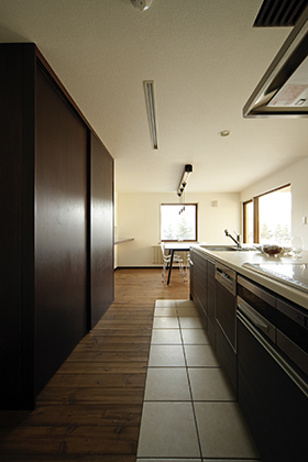 奥のダイニングキッチンはフロアーを高くして天井との距離感が縮まることにより、テーブルに座ったときに丁度よく落ち着く空間となっている。