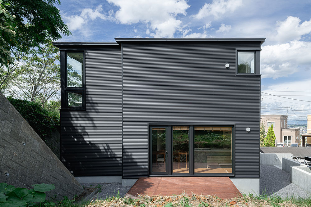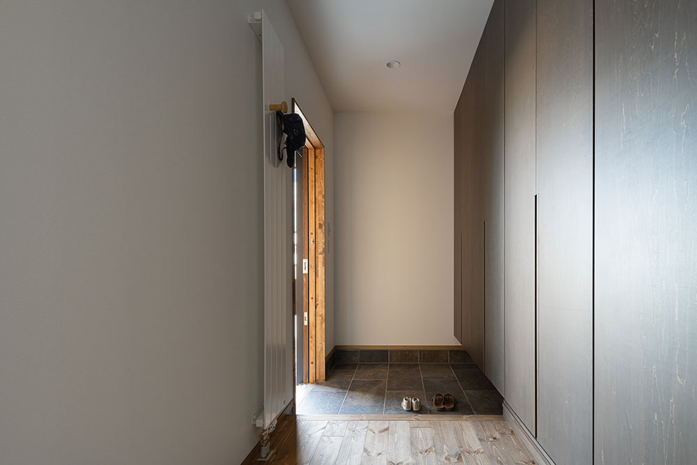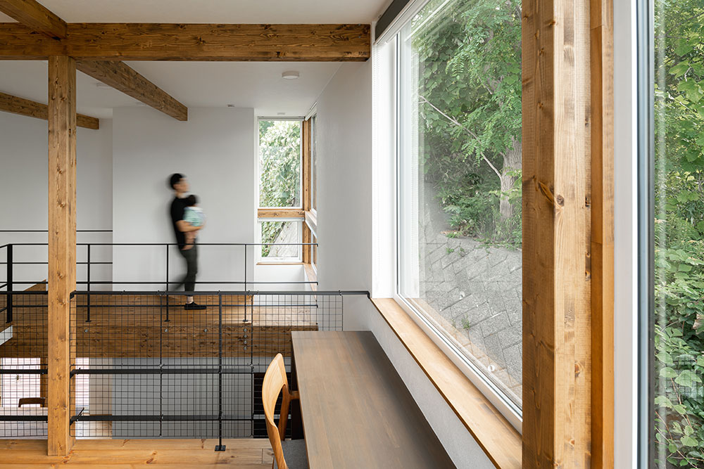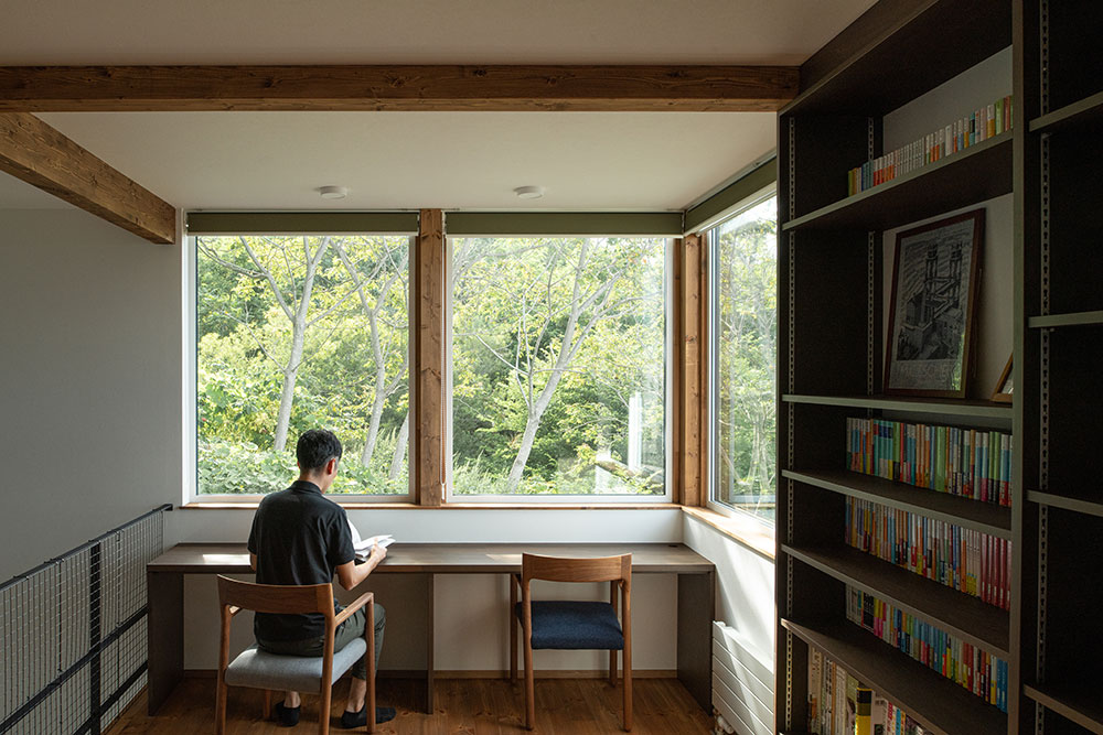 玄関を入ると目の前に広がる吹き抜けの大窓。オーナー様のご希望で伐採を免れた一番手前の白樺は、迫力ある美しい姿を見せてくれます。