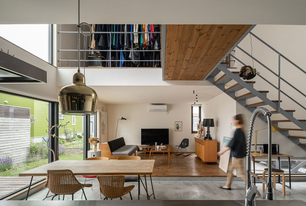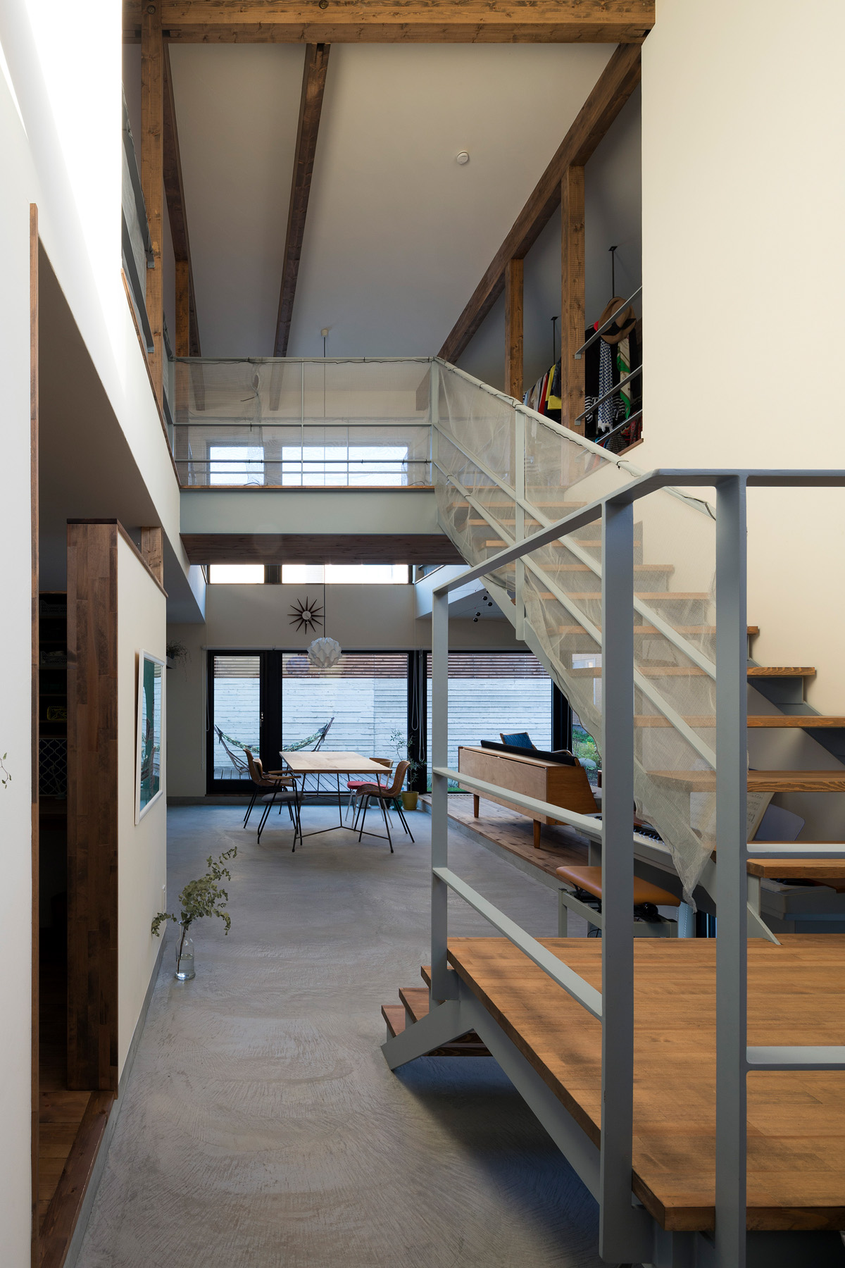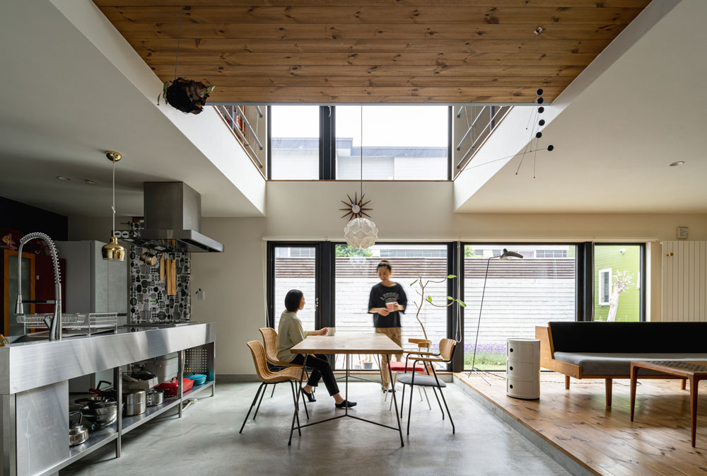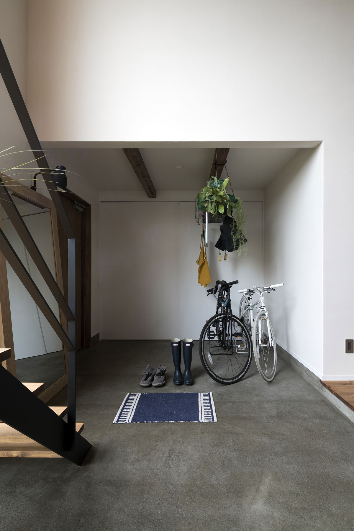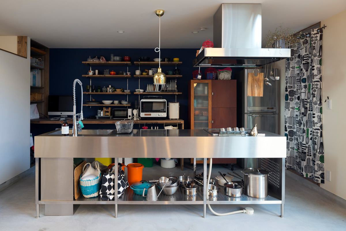 自転車いじりをする土間、植物をたくさんディスプレイできる場所、 多趣味なご夫妻は一緒に大きなキッチンでランチをつくる。 大きな窓、緑の庭、心地よい陽射。 だだっぴろく、武骨に楽しむ。