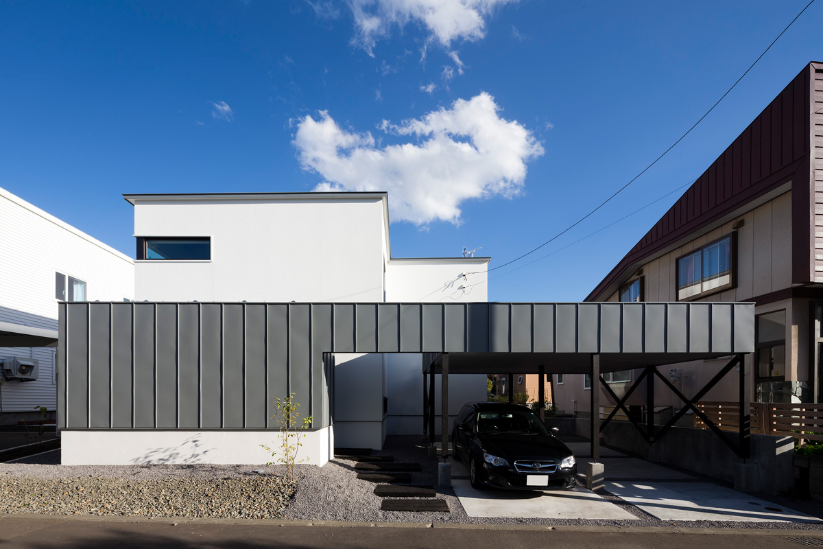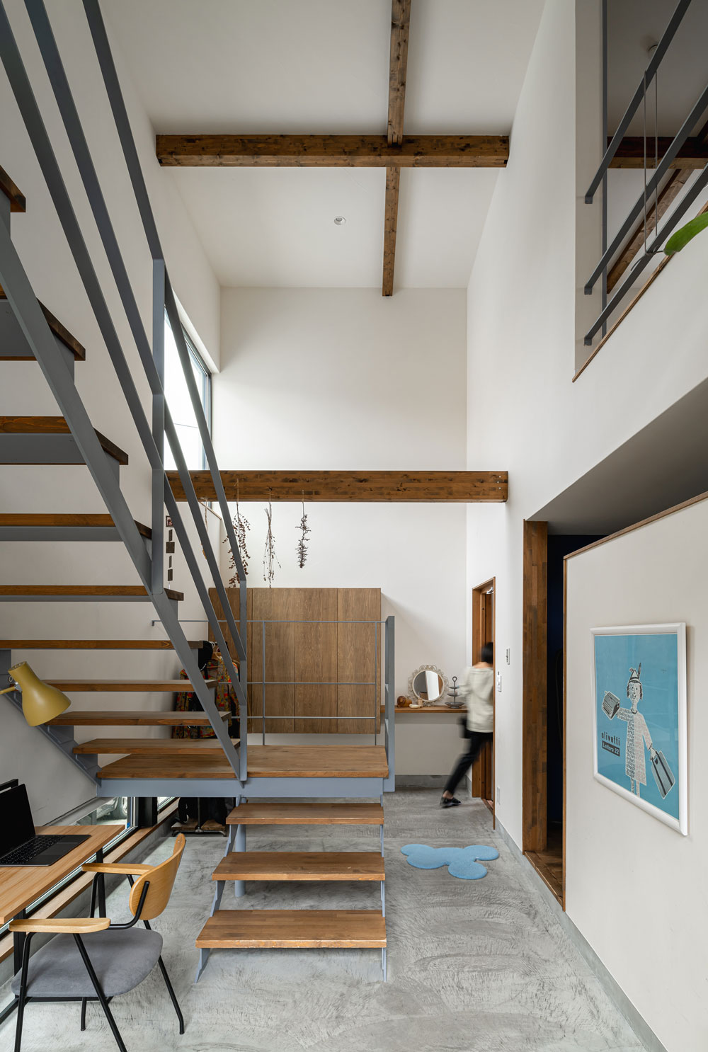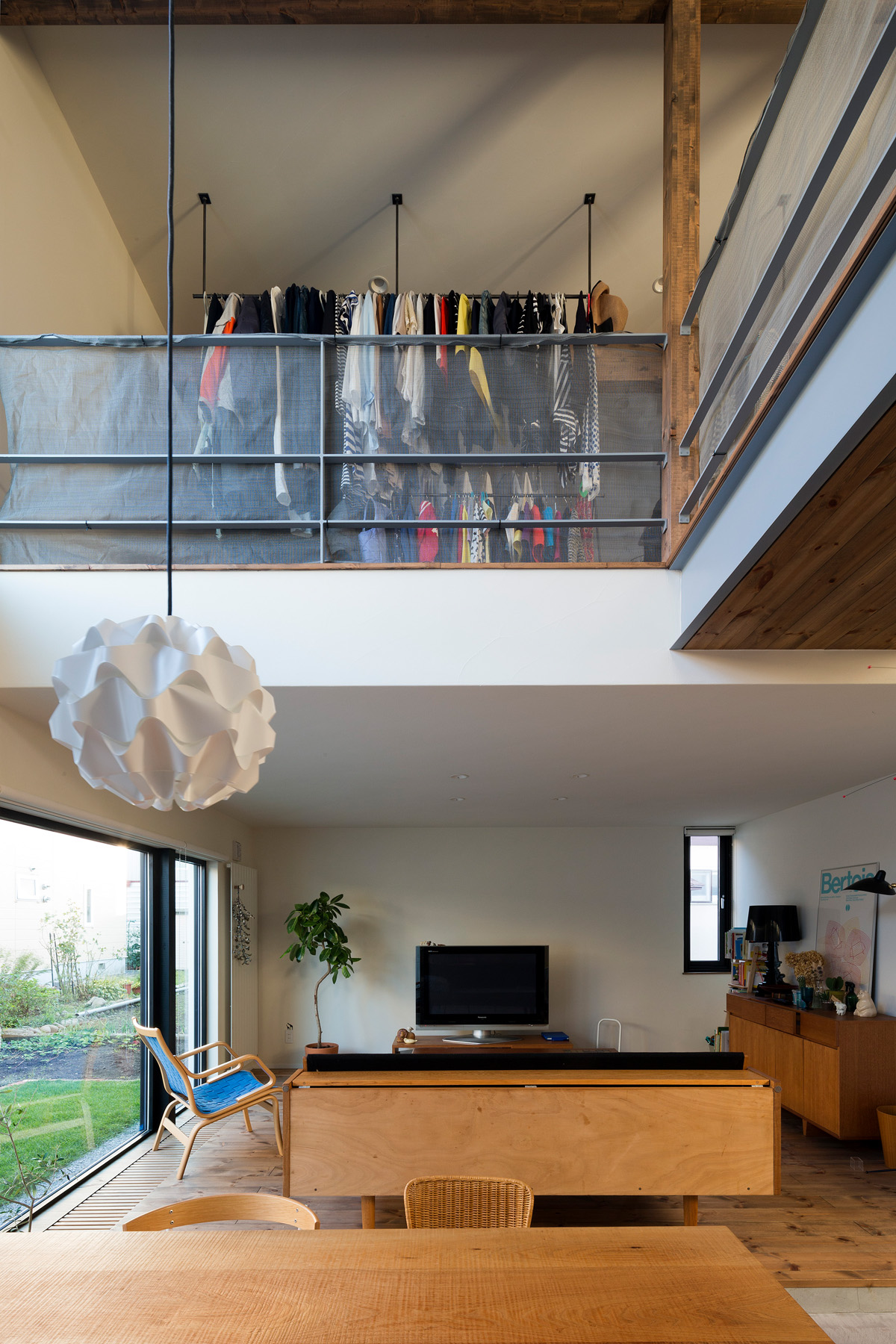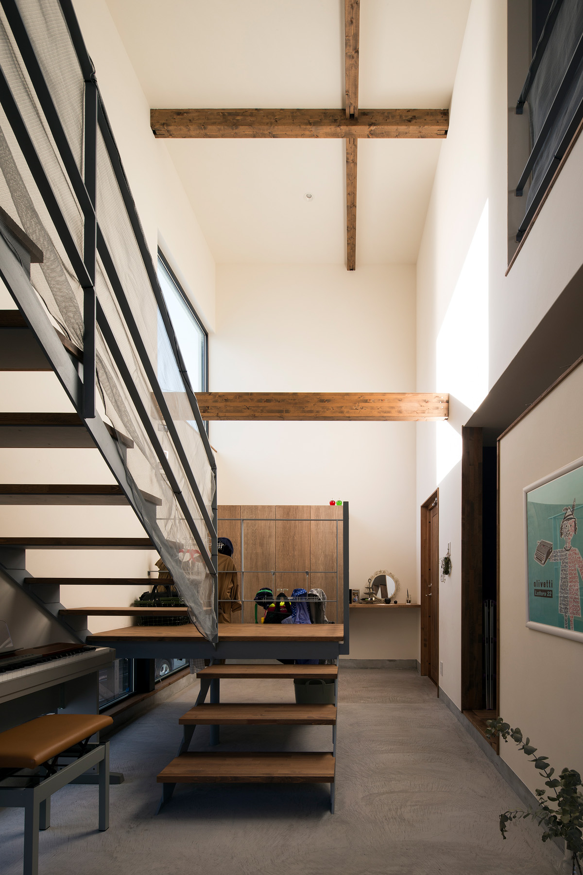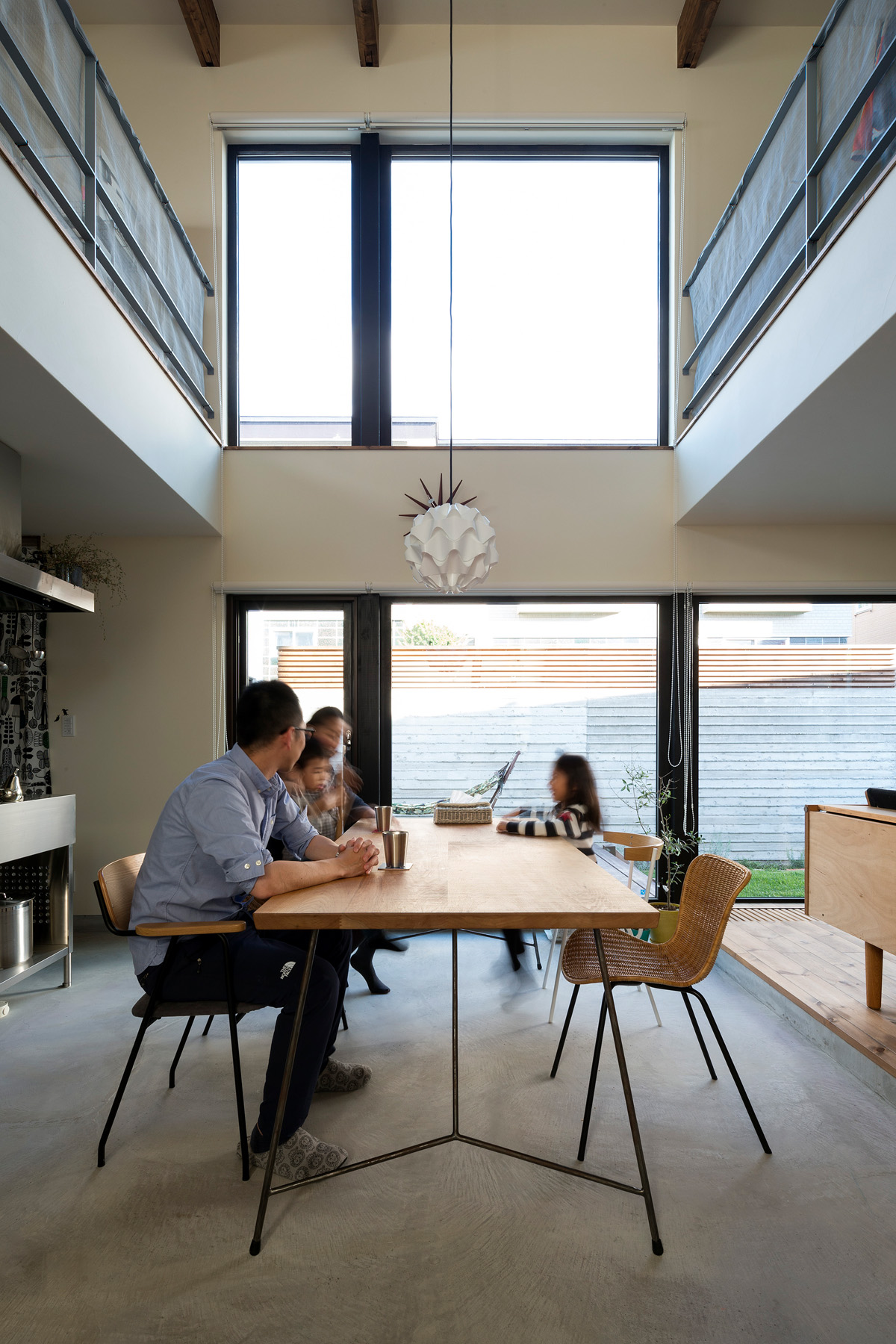 自転車いじりをする土間、植物をたくさんディスプレイできる場所、 多趣味なご夫妻は一緒に大きなキッチンでランチをつくる。 大きな窓、緑の庭、心地よい陽射。 だだっぴろく、武骨に楽しむ。
