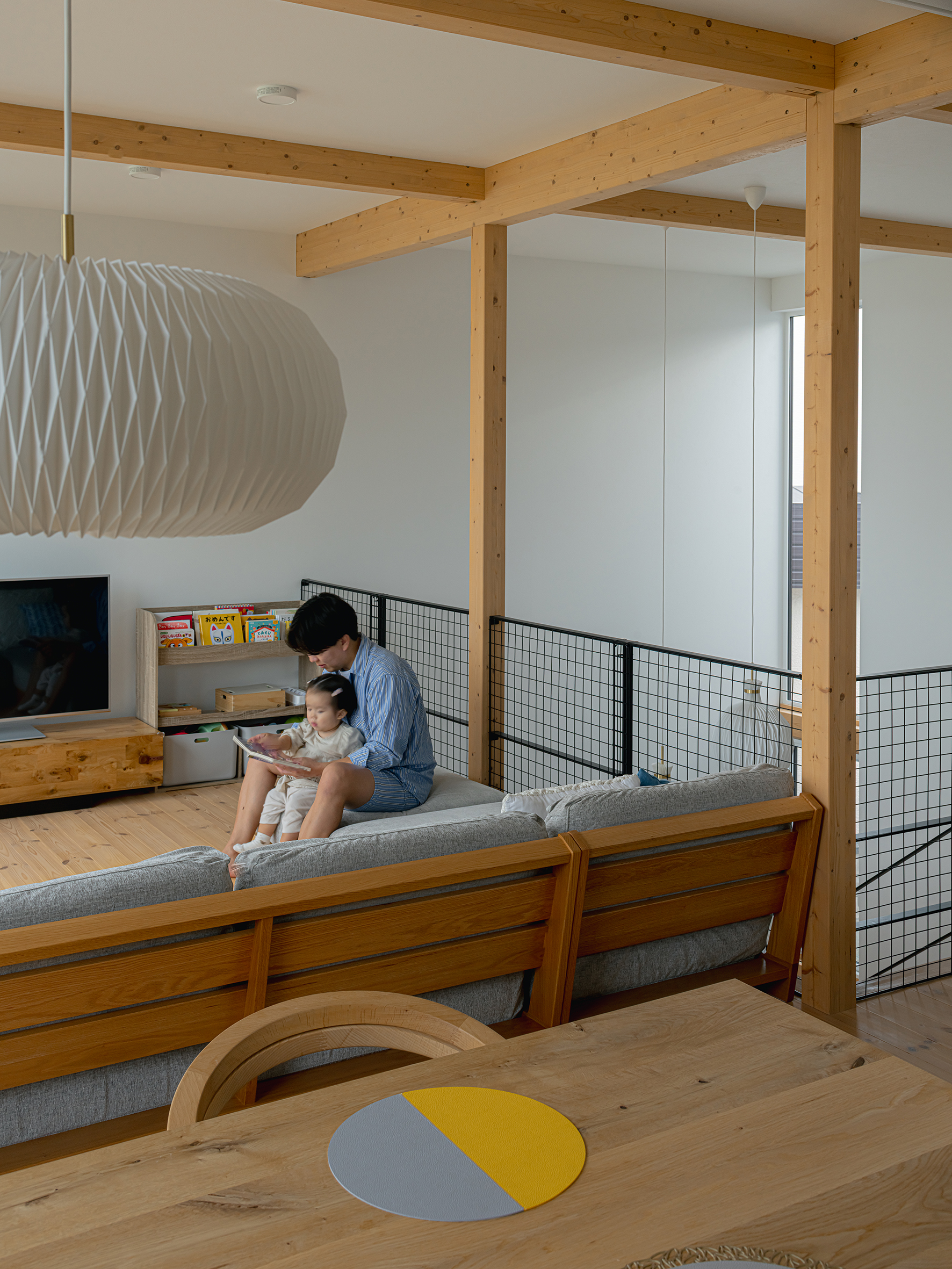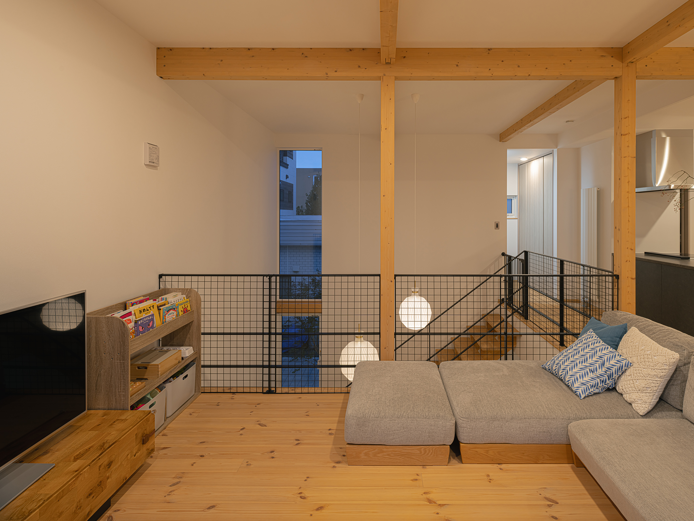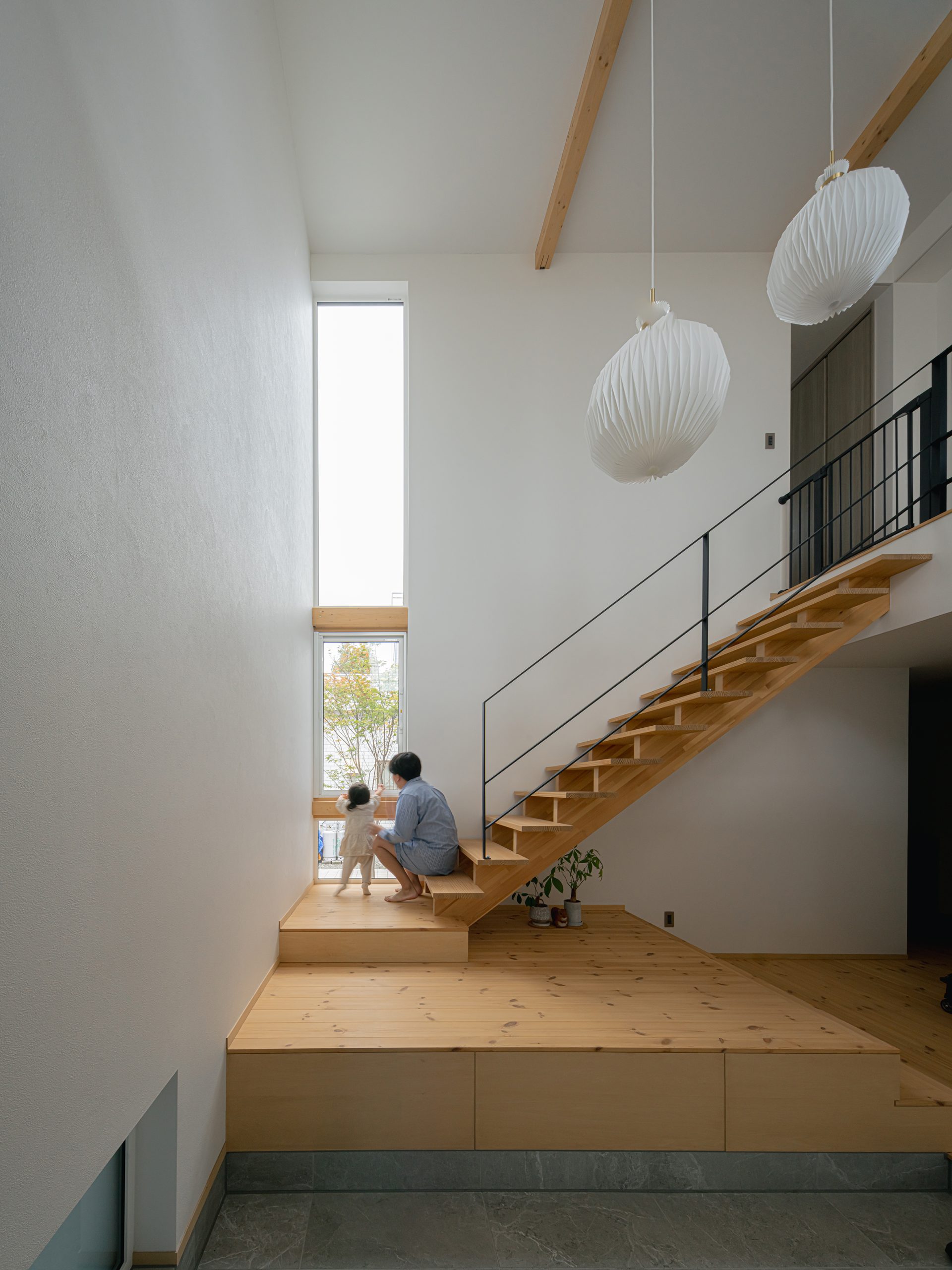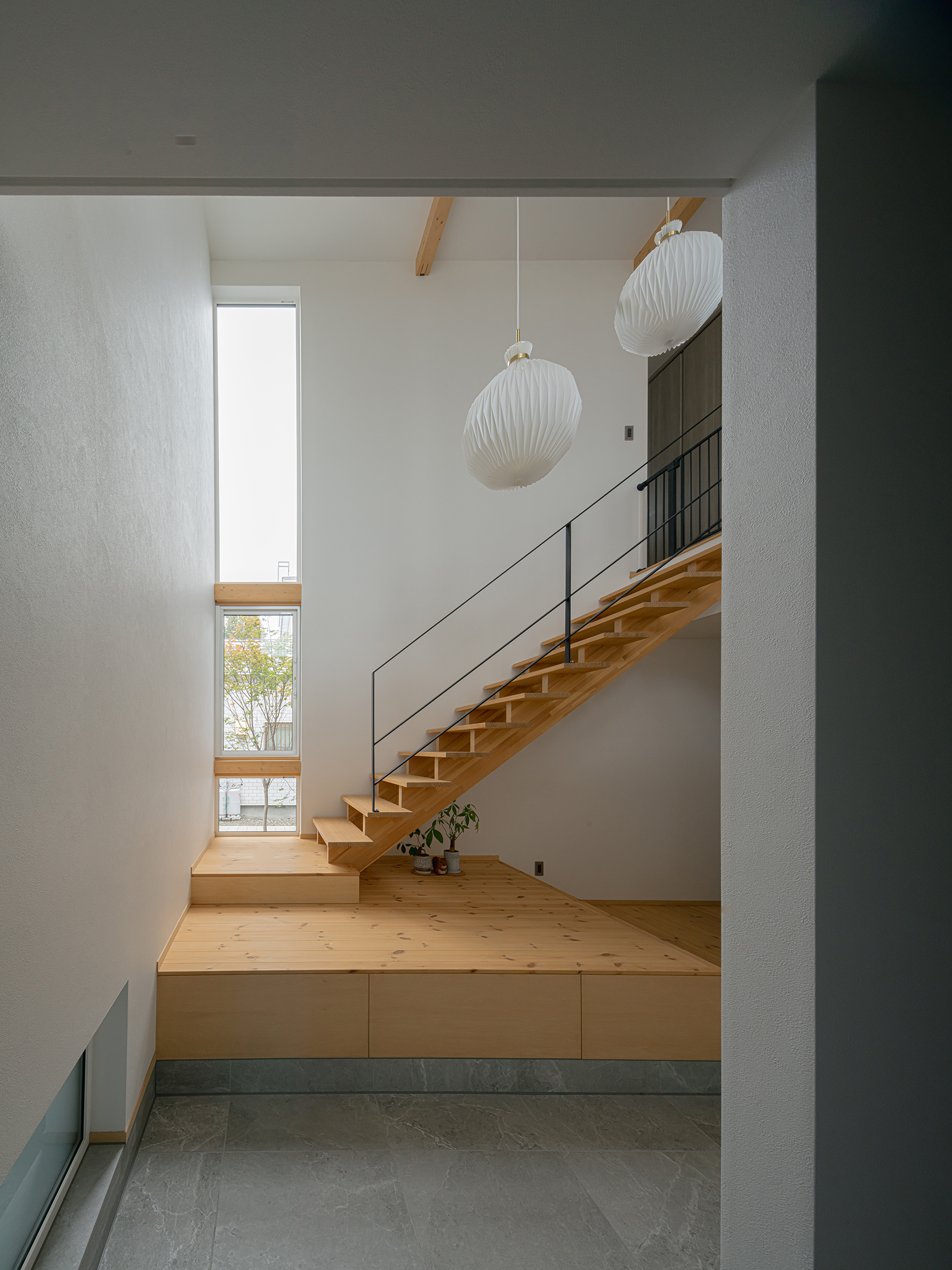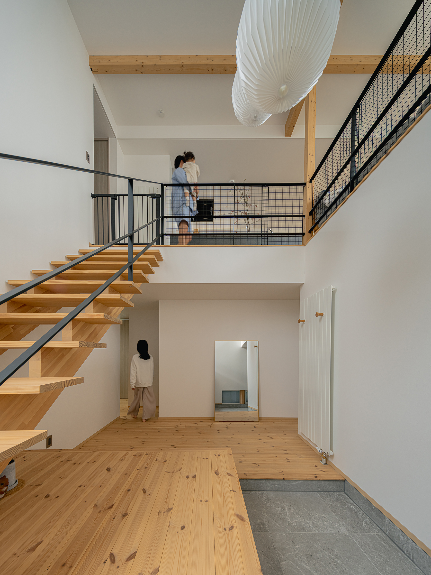 「やわらかい光が射す家」 家族が集まる場所はいつも明るい お互いがどこにいても、何をしても感じられる 吹き抜けからは、やわらかい光が射しこむ フリースペースから見える景色を楽しみながら 家族と共に成長していく