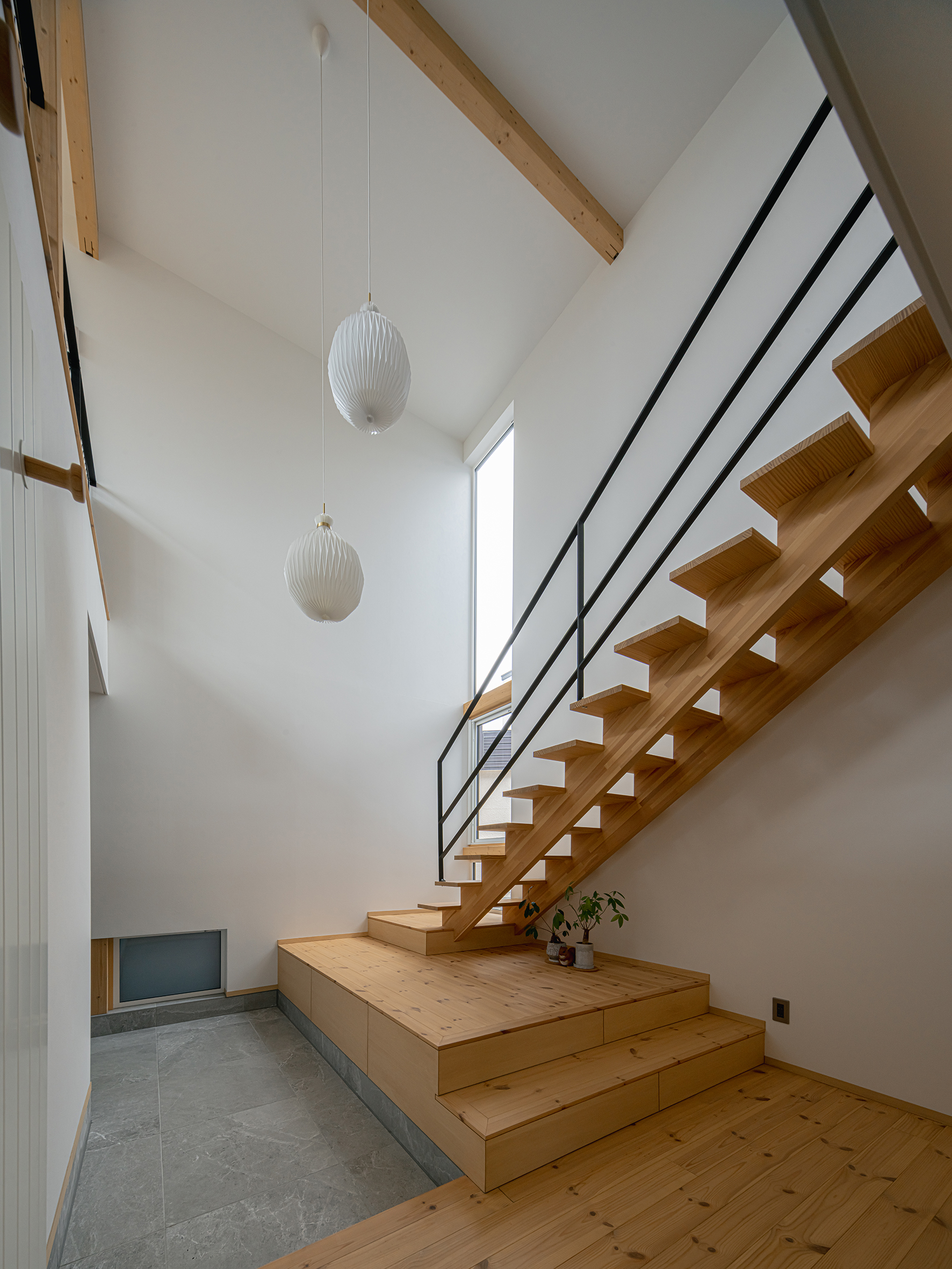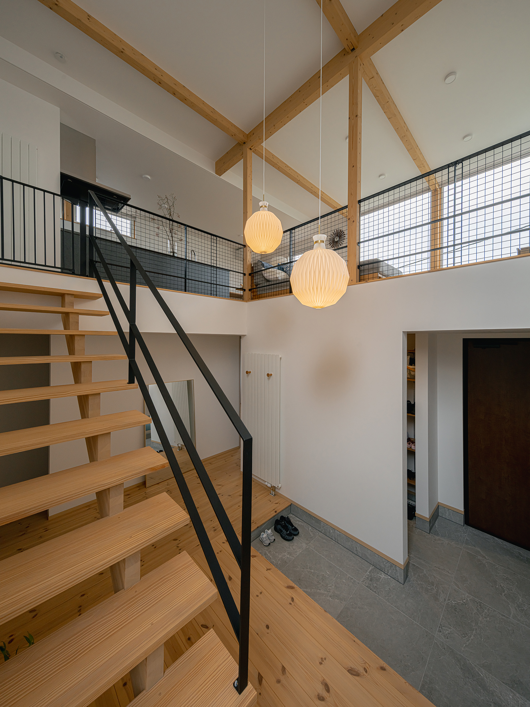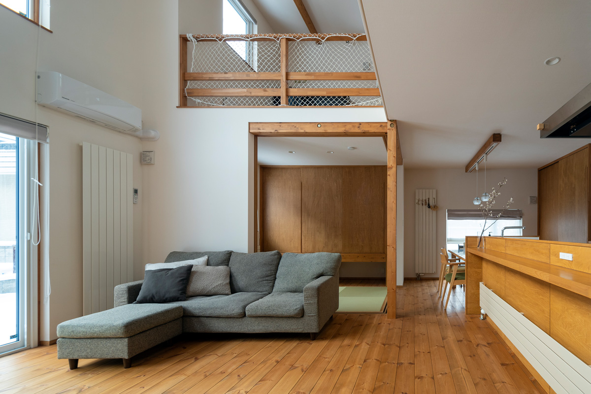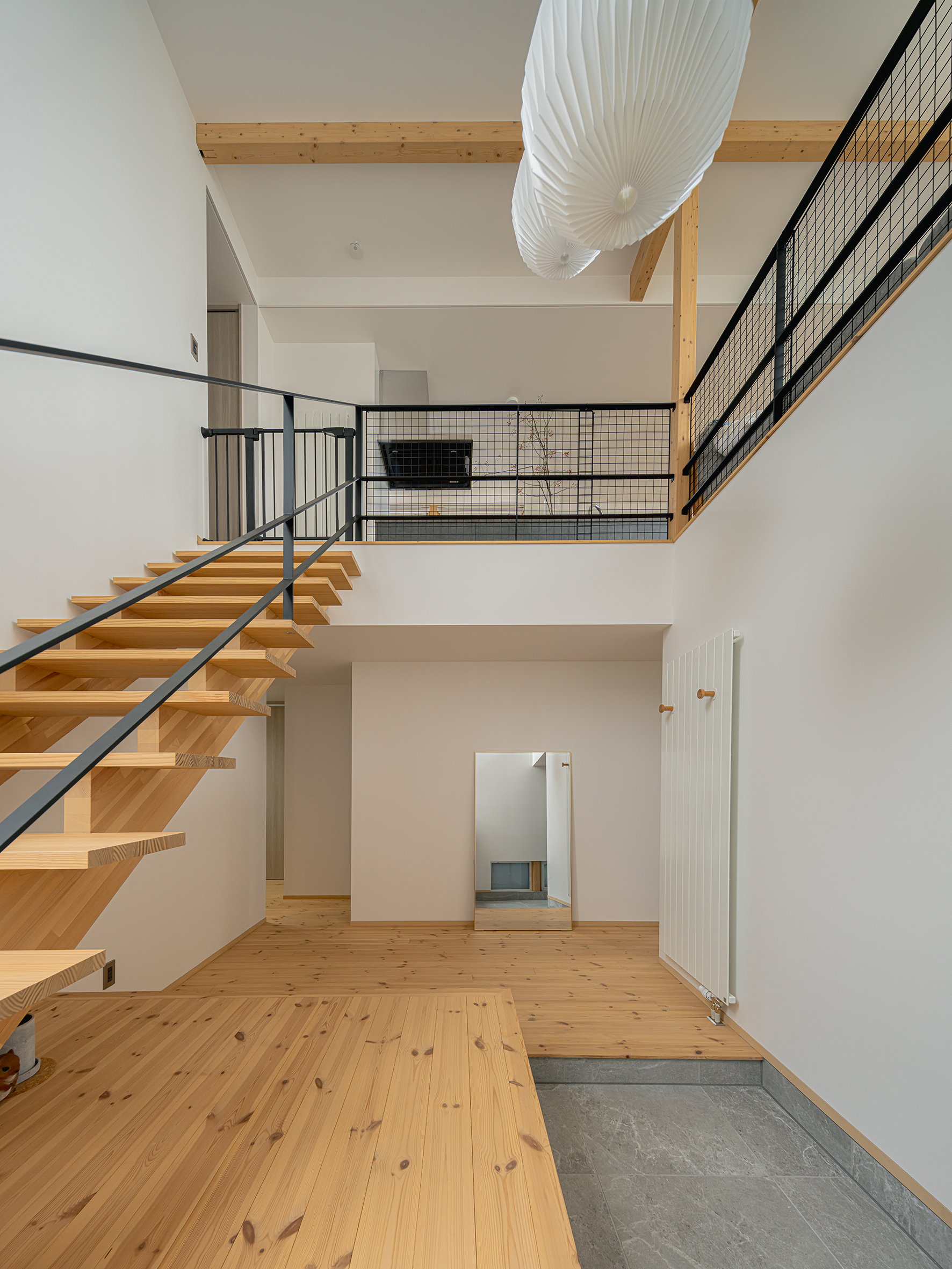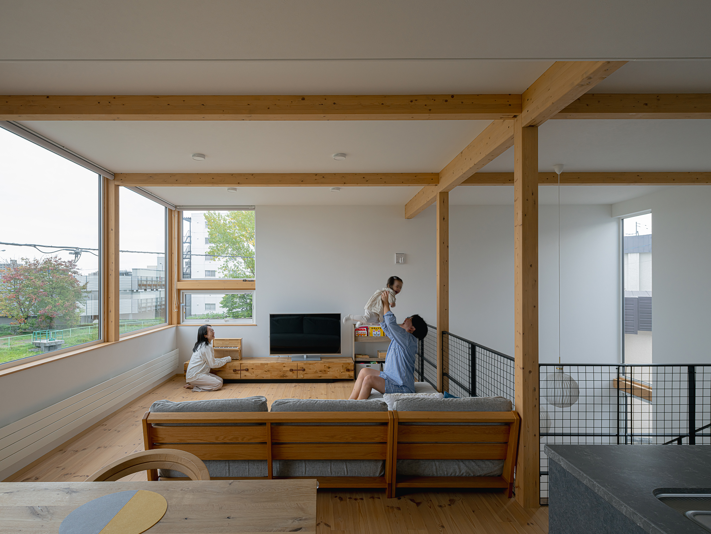 「やわらかい光が射す家」 家族が集まる場所はいつも明るい お互いがどこにいても、何をしても感じられる 吹き抜けからは、やわらかい光が射しこむ フリースペースから見える景色を楽しみながら 家族と共に成長していく