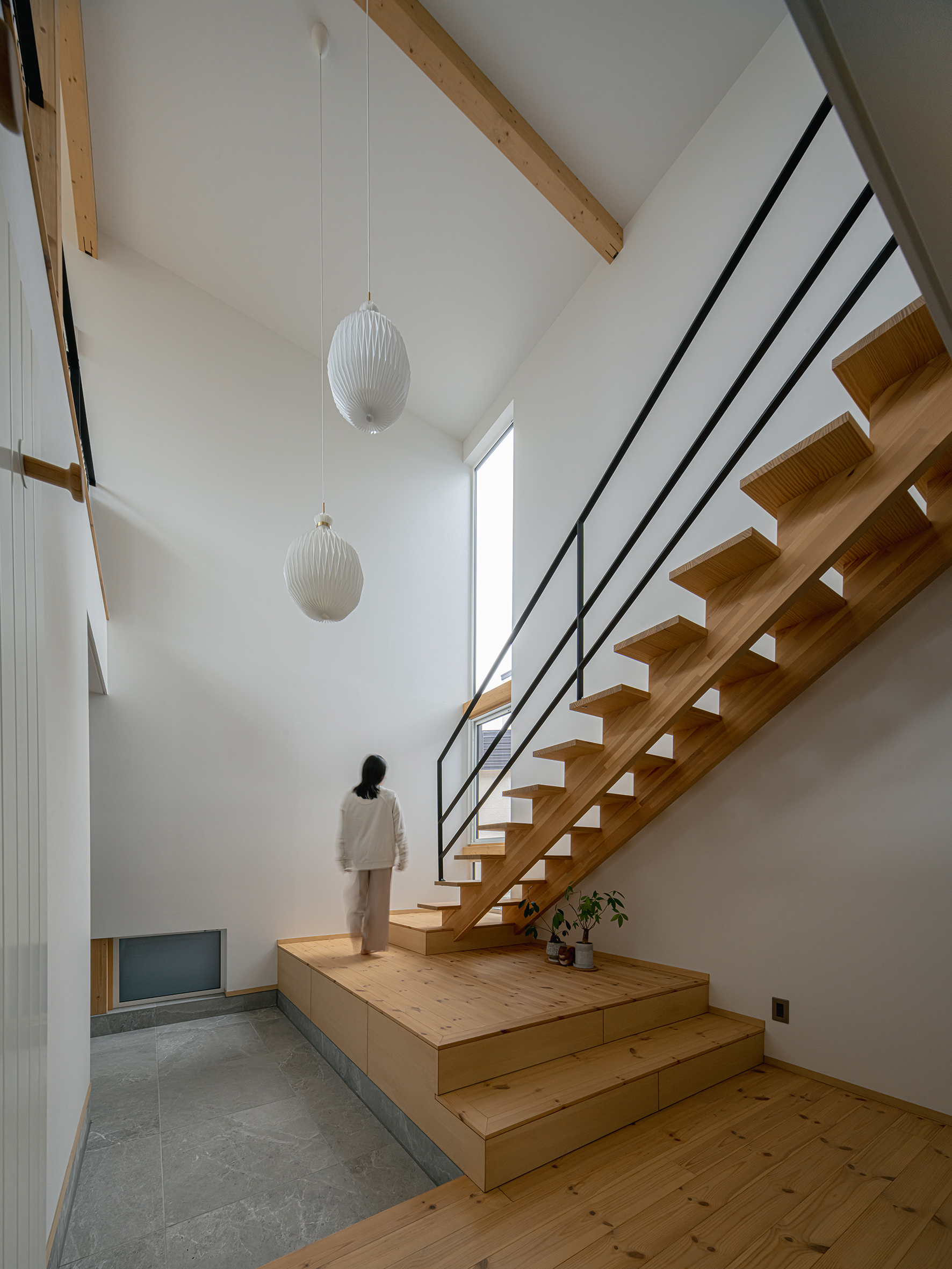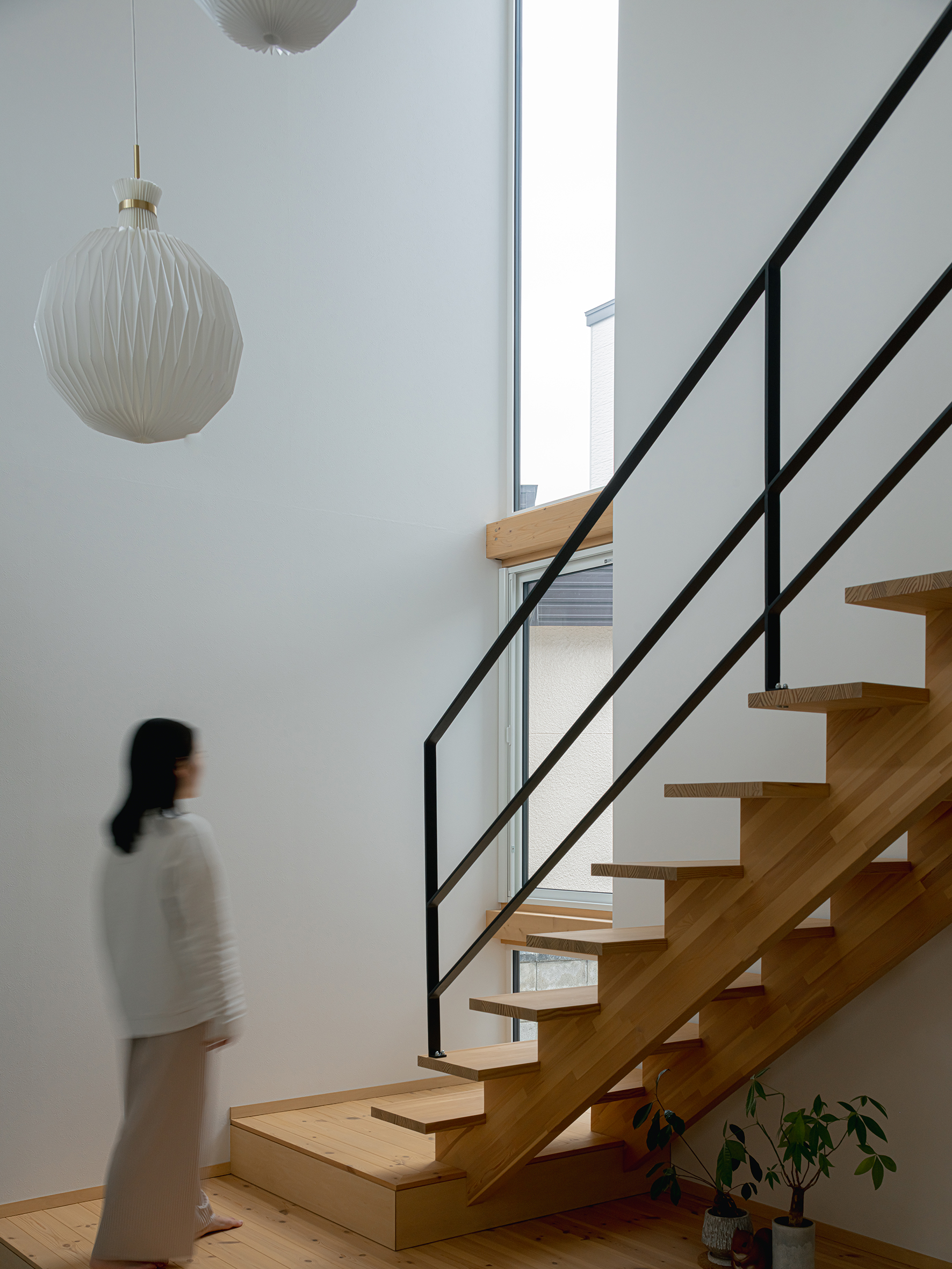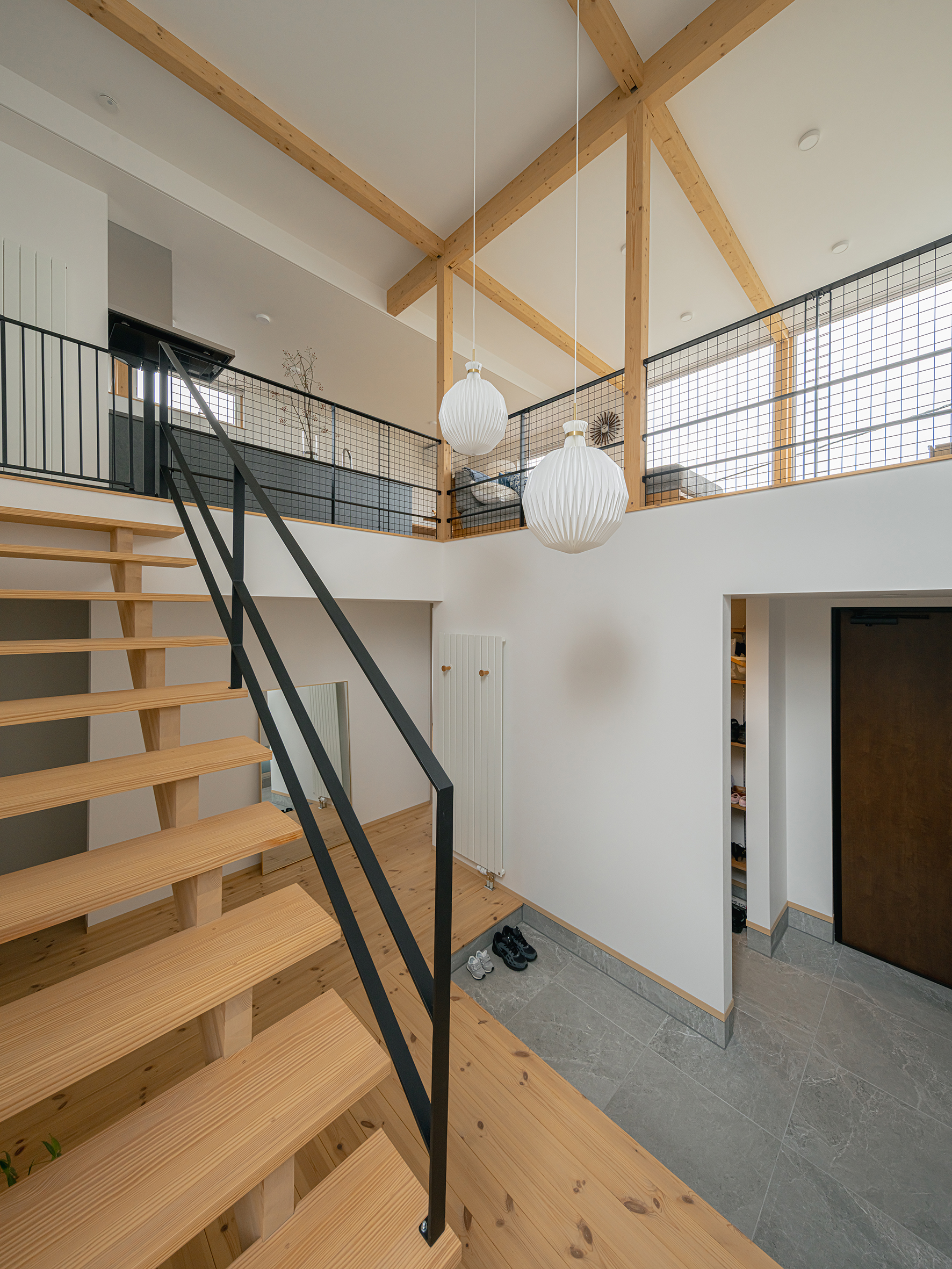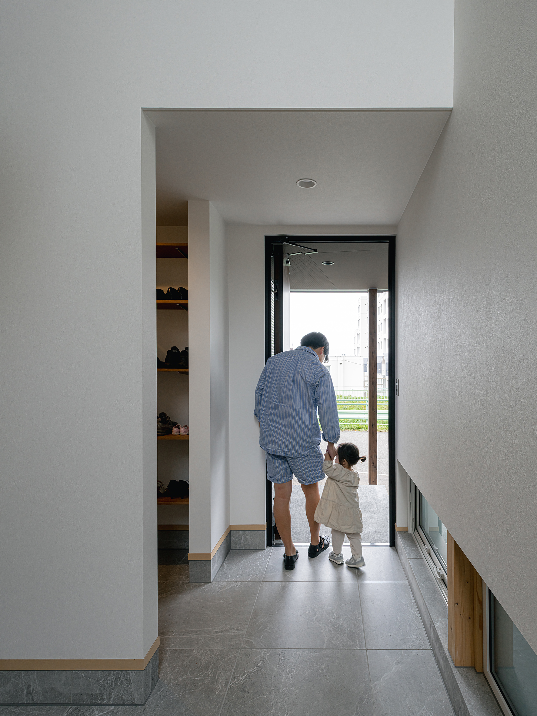 「やわらかい光が射す家」 家族が集まる場所はいつも明るい お互いがどこにいても、何をしても感じられる 吹き抜けからは、やわらかい光が射しこむ フリースペースから見える景色を楽しみながら 家族と共に成長していく