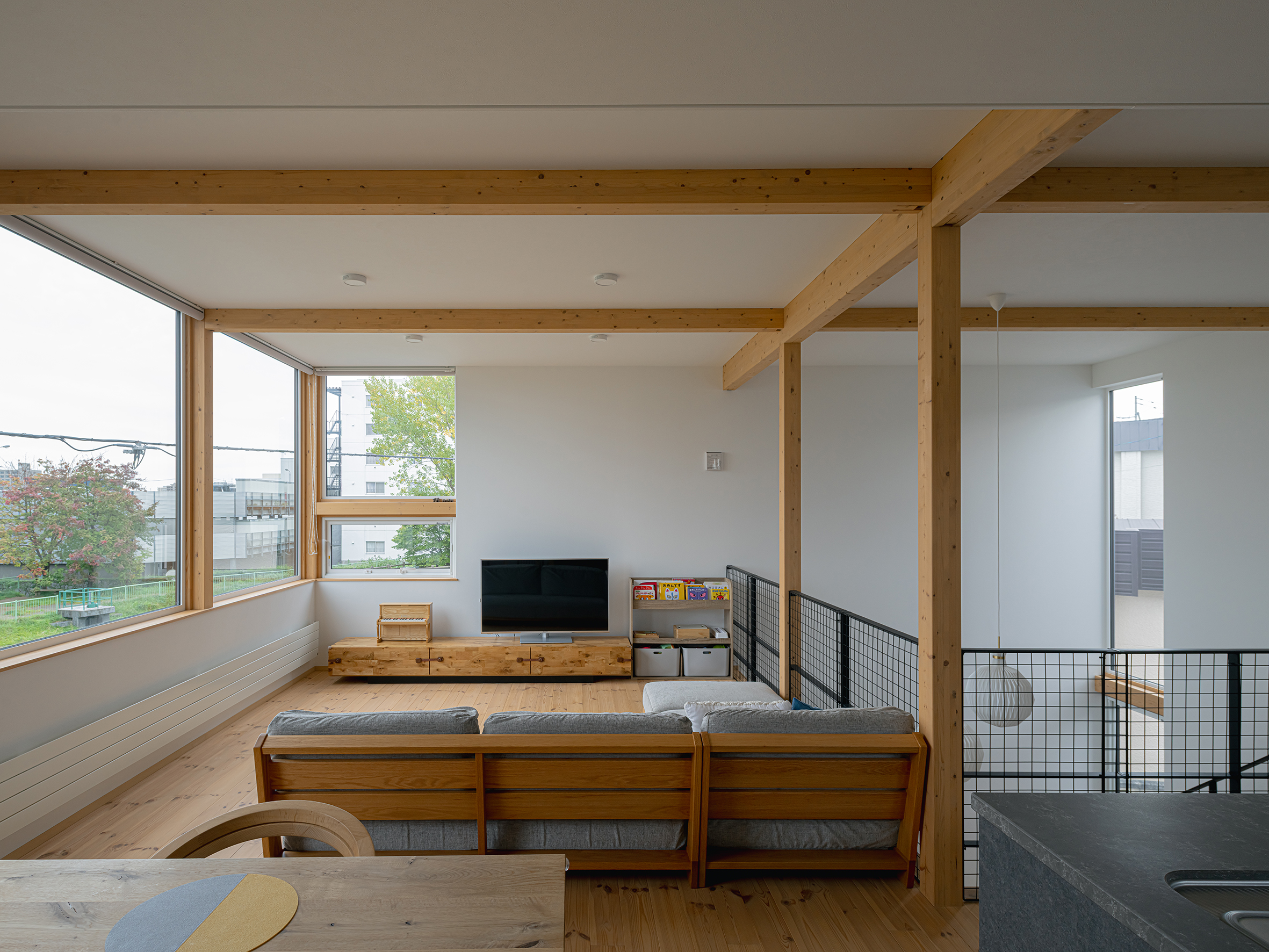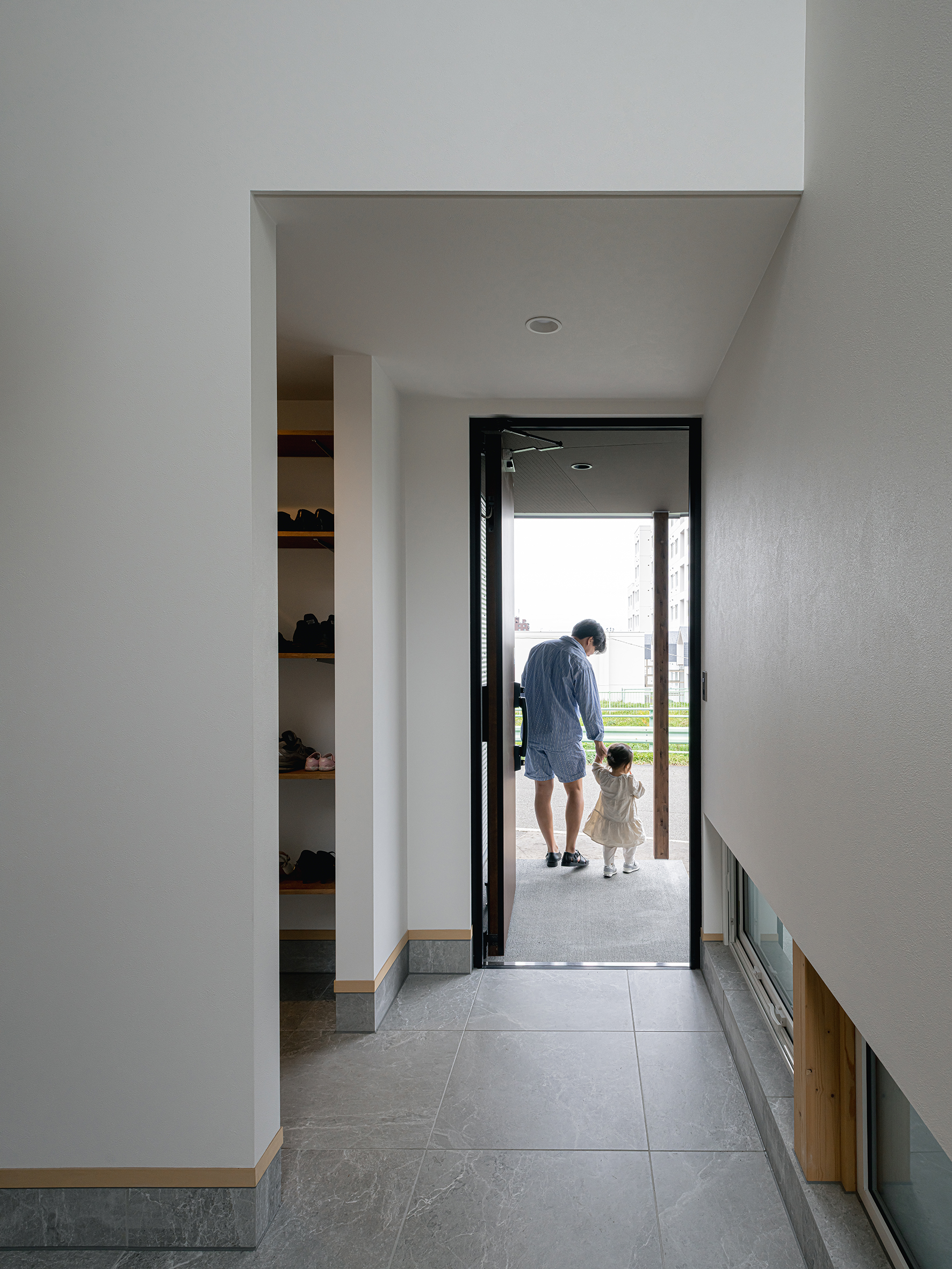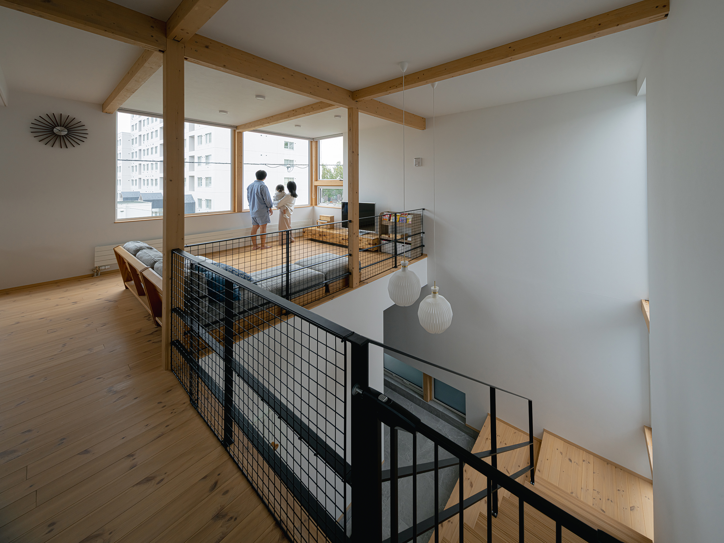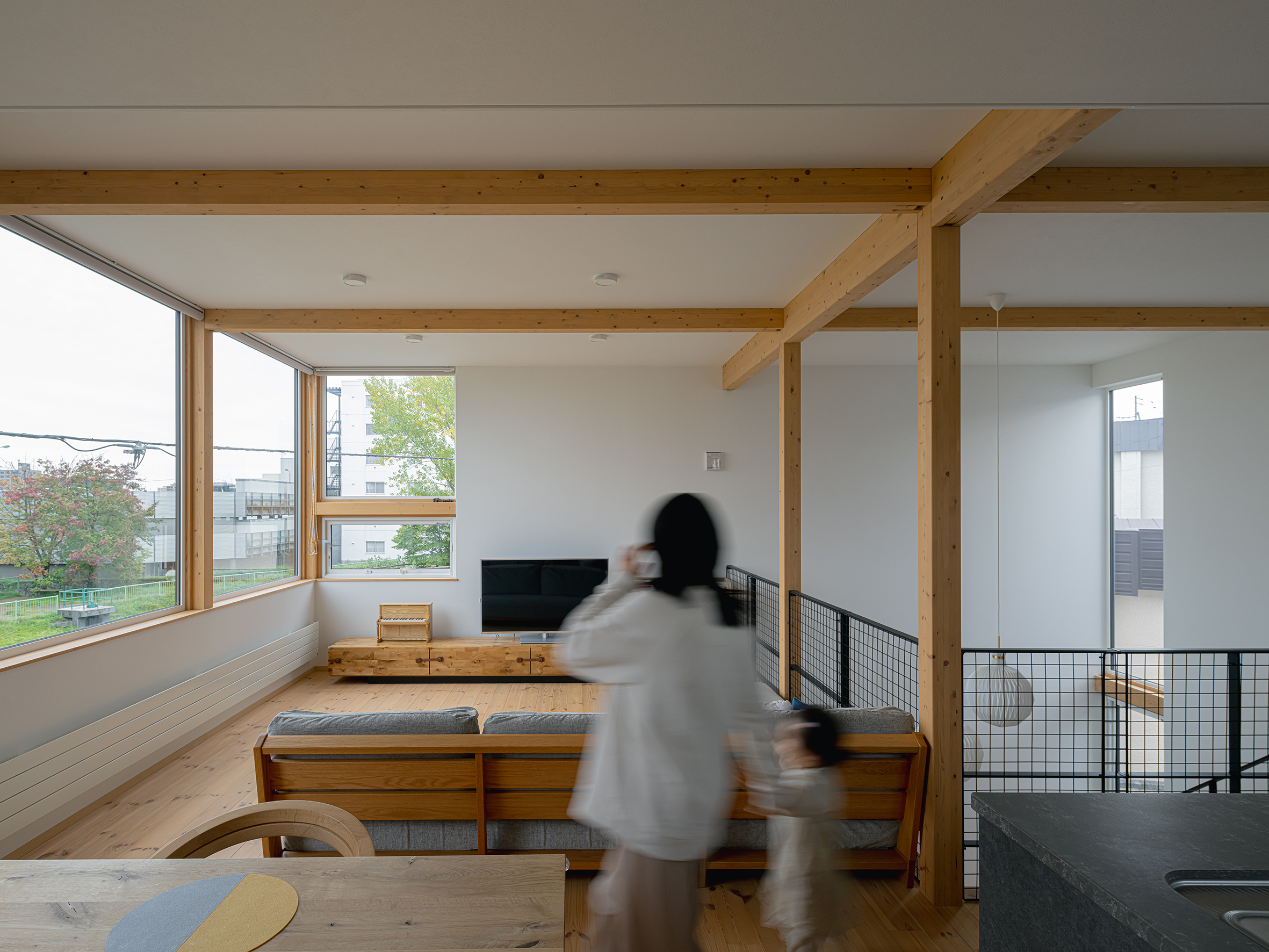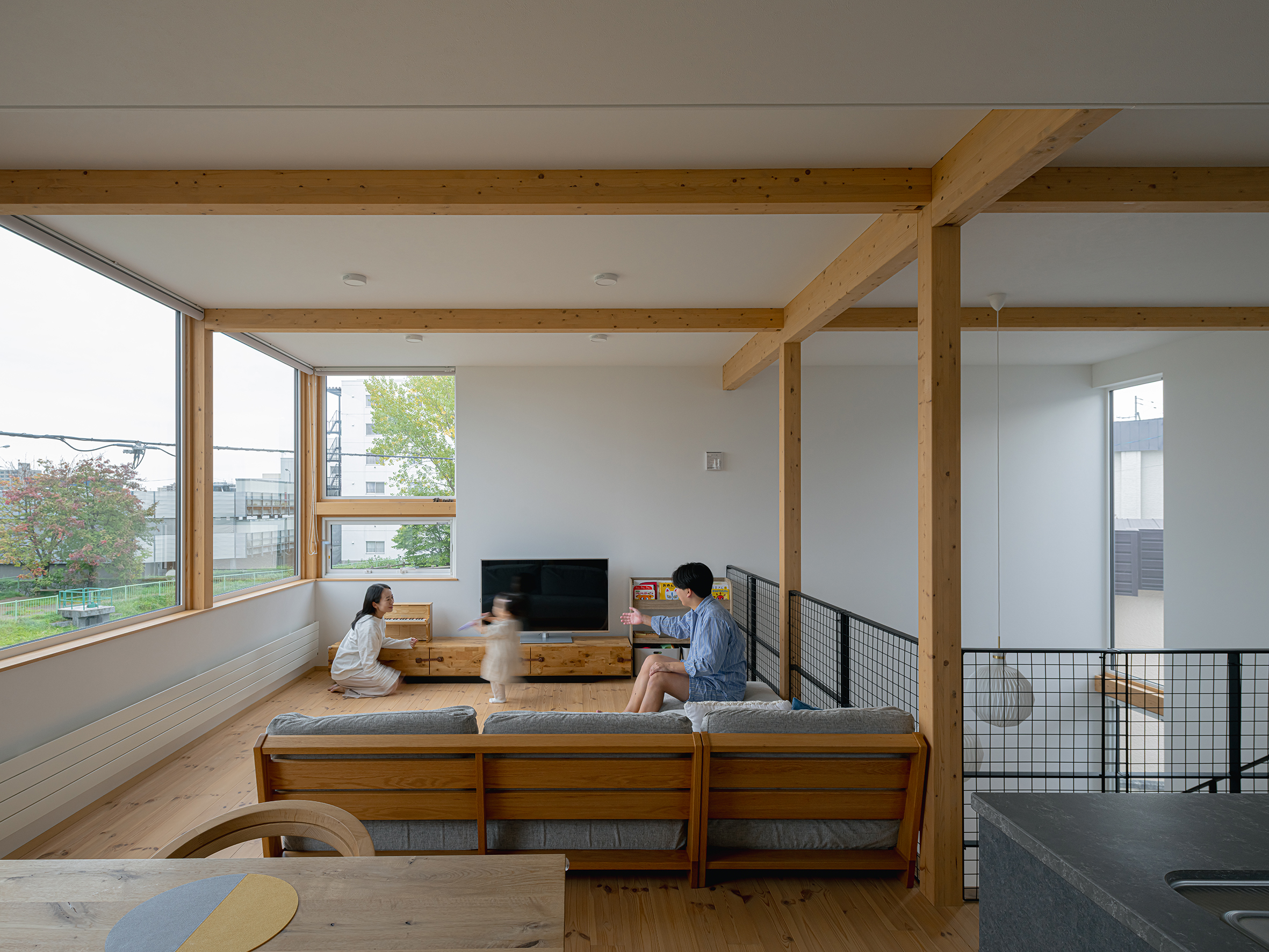 「やわらかい光が射す家」 家族が集まる場所はいつも明るい お互いがどこにいても、何をしても感じられる 吹き抜けからは、やわらかい光が射しこむ フリースペースから見える景色を楽しみながら 家族と共に成長していく