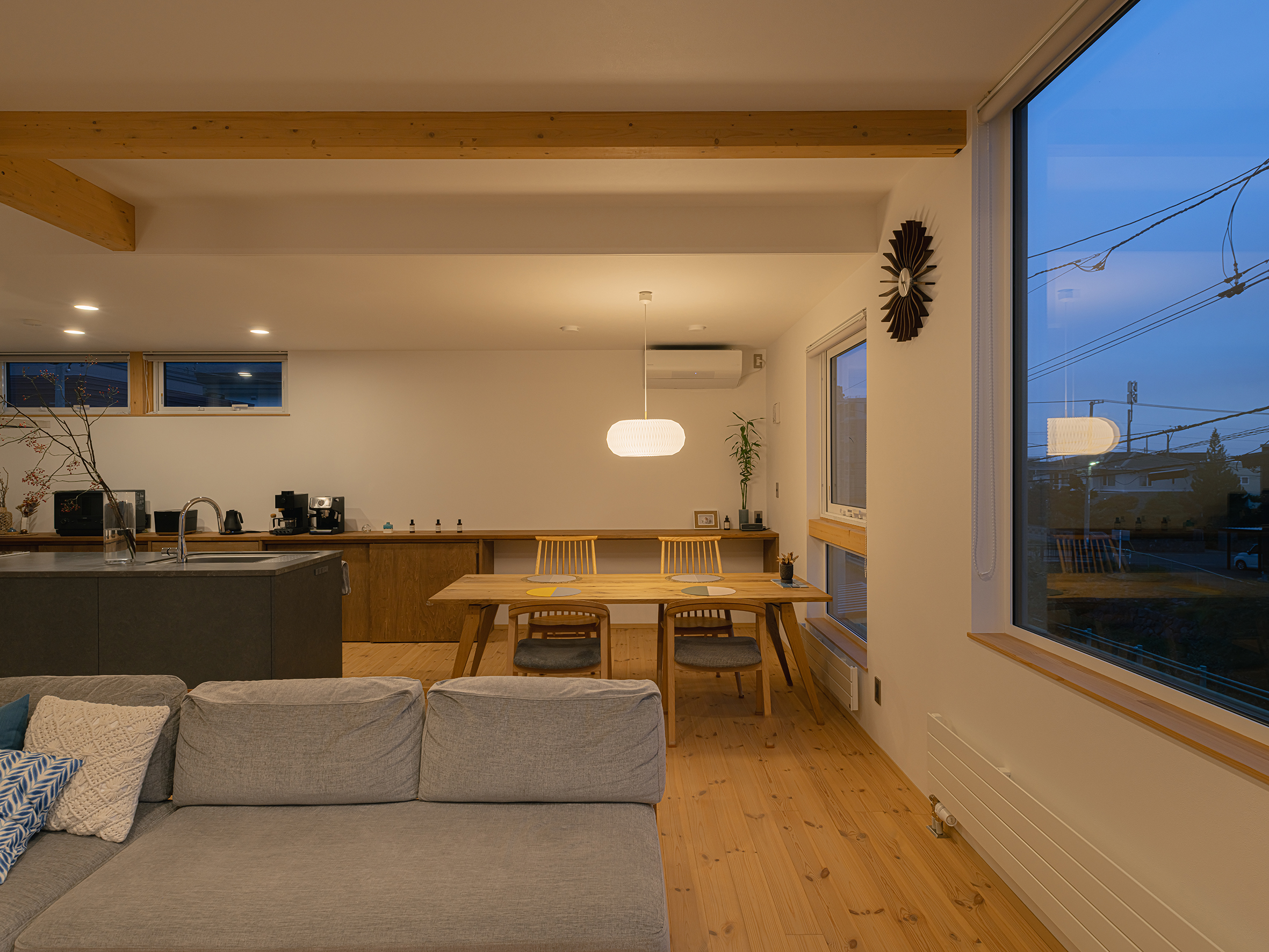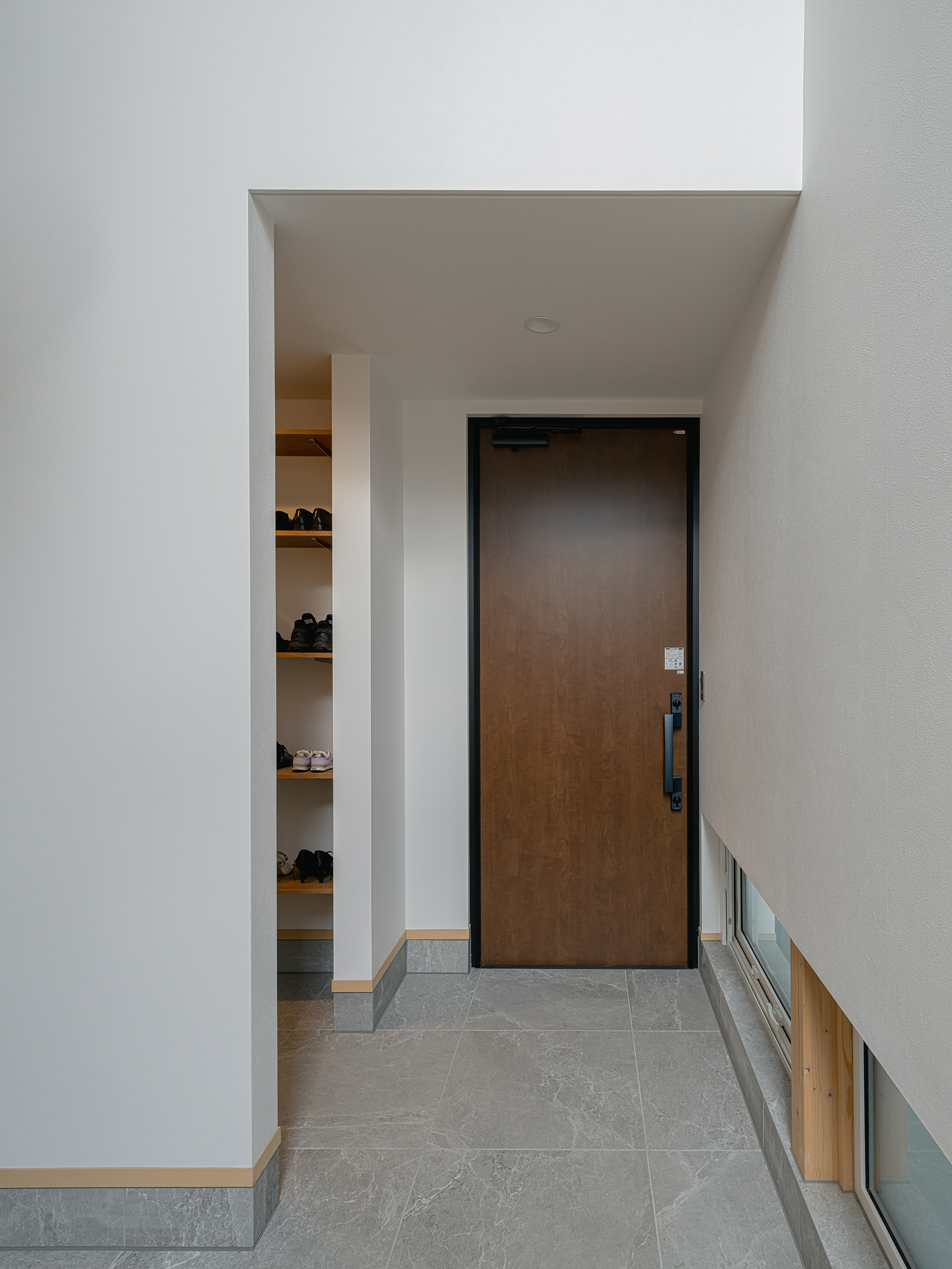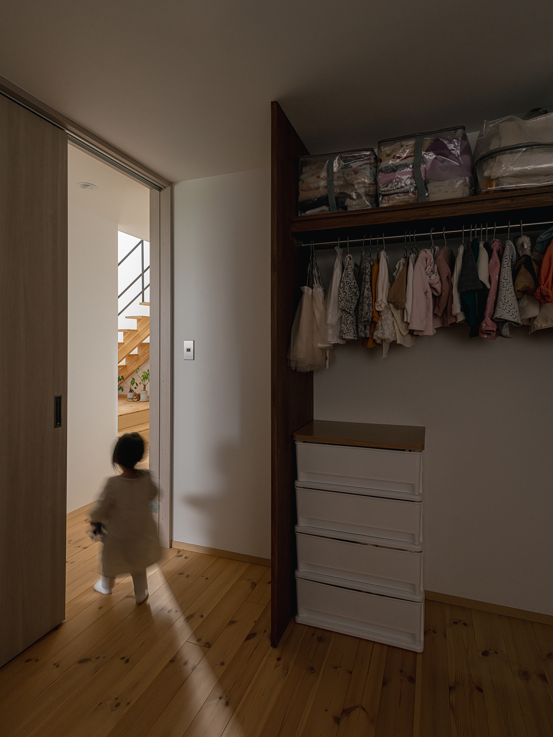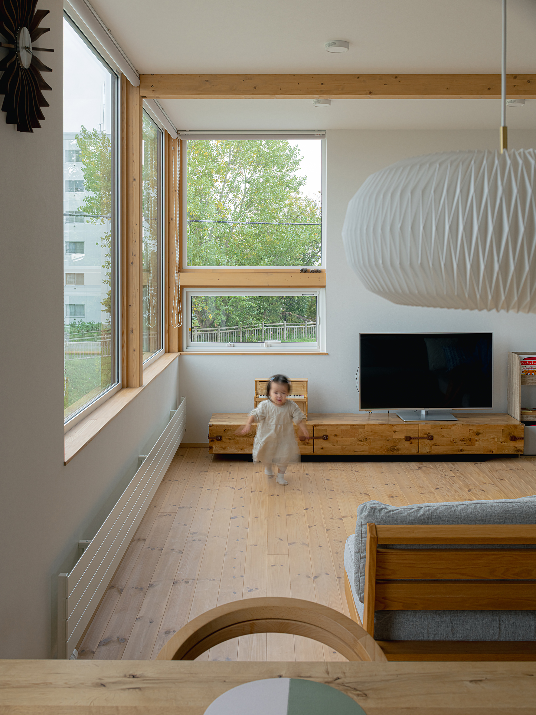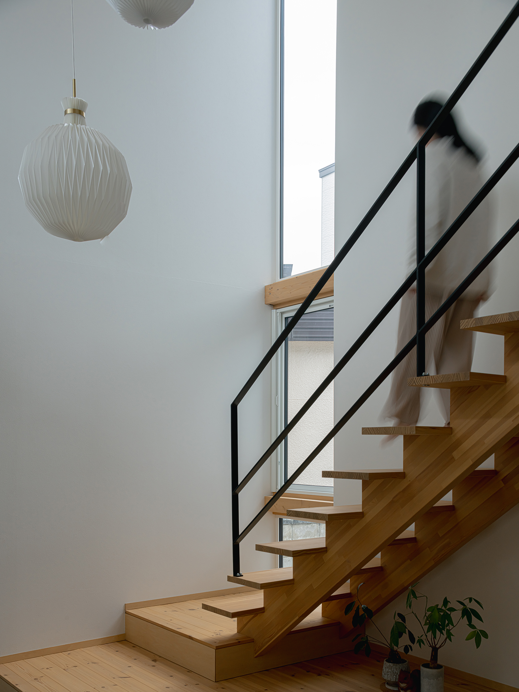 「やわらかい光が射す家」 家族が集まる場所はいつも明るい お互いがどこにいても、何をしても感じられる 吹き抜けからは、やわらかい光が射しこむ フリースペースから見える景色を楽しみながら 家族と共に成長していく