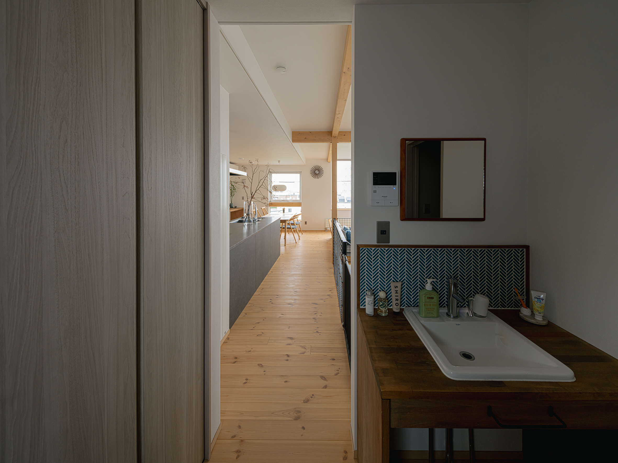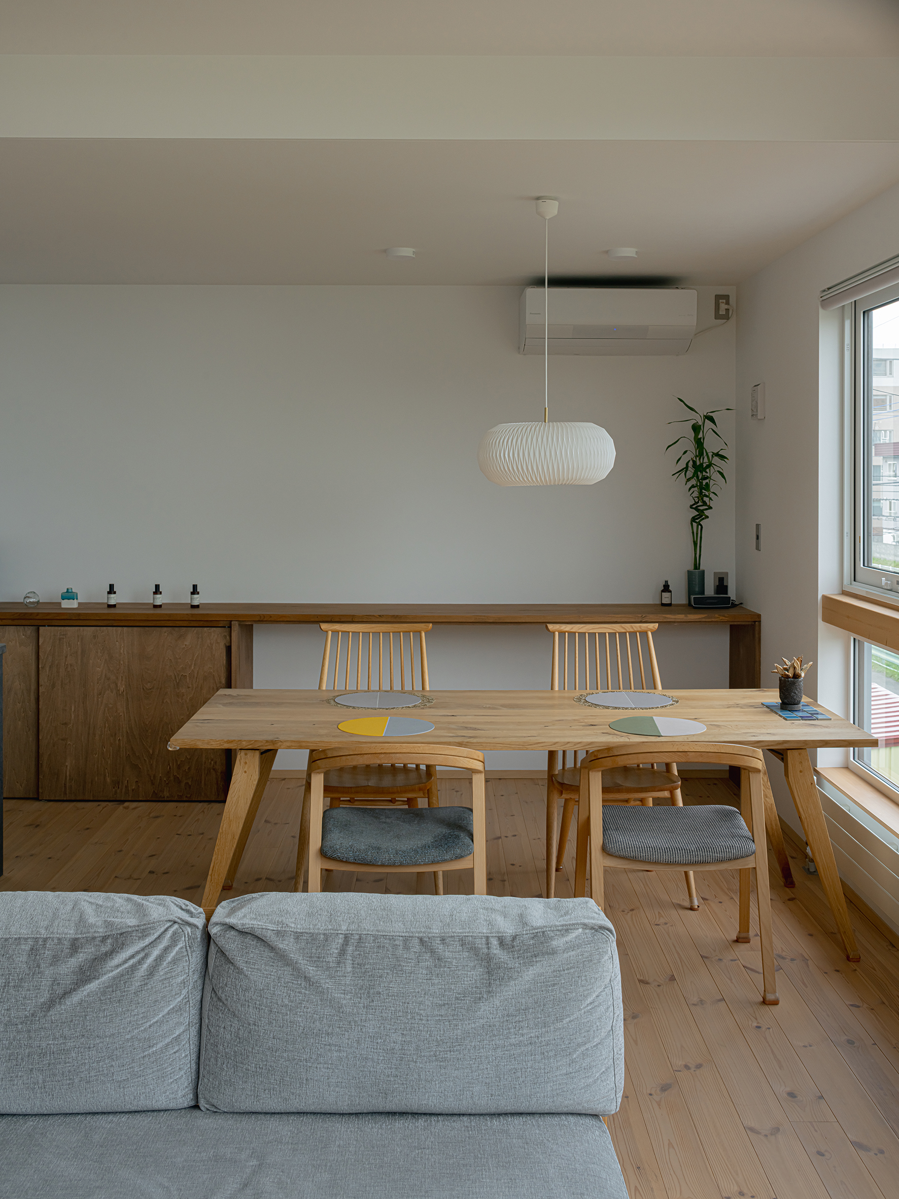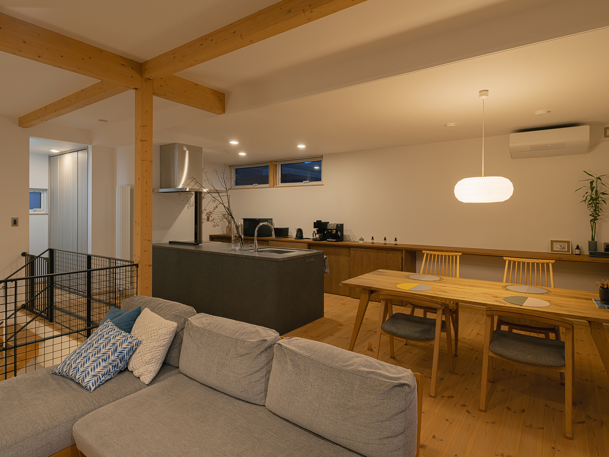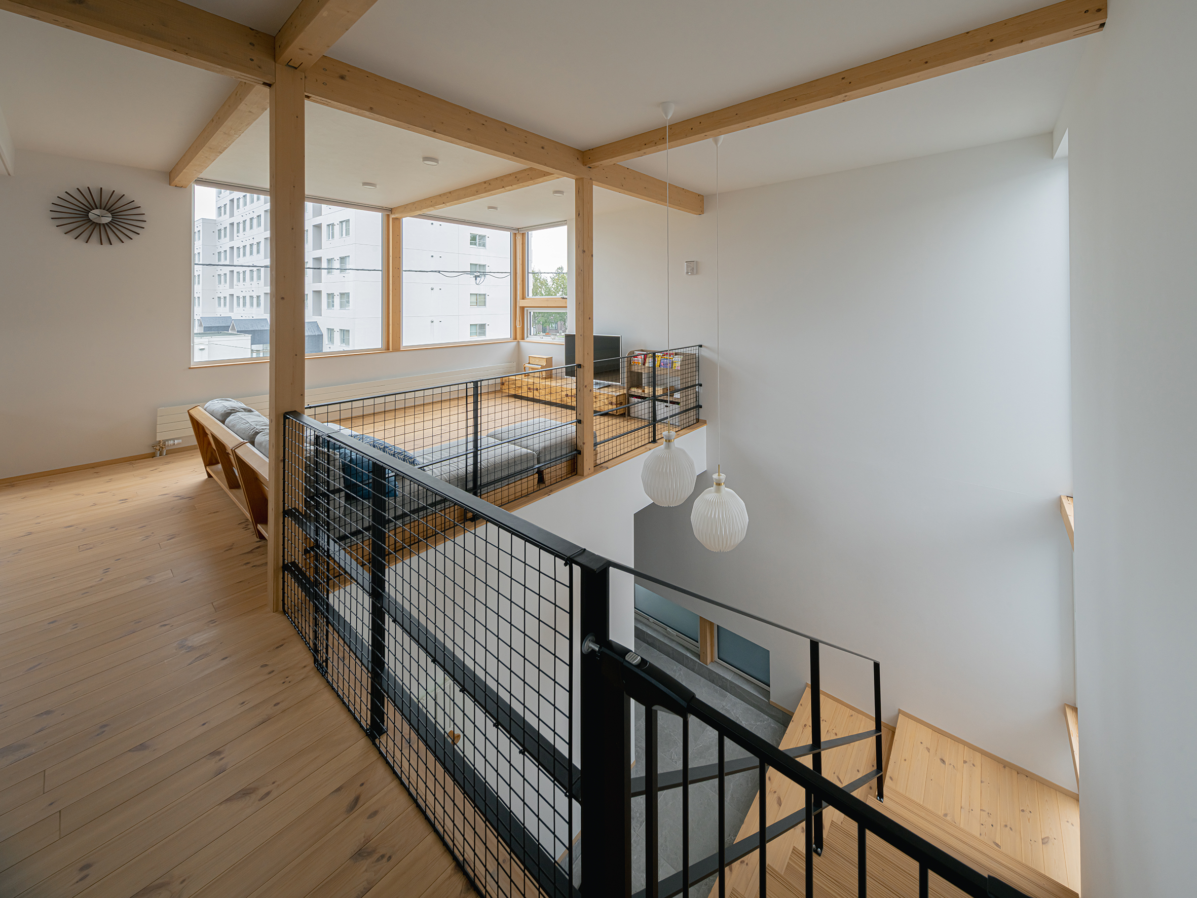 「やわらかい光が射す家」 家族が集まる場所はいつも明るい お互いがどこにいても、何をしても感じられる 吹き抜けからは、やわらかい光が射しこむ フリースペースから見える景色を楽しみながら 家族と共に成長していく