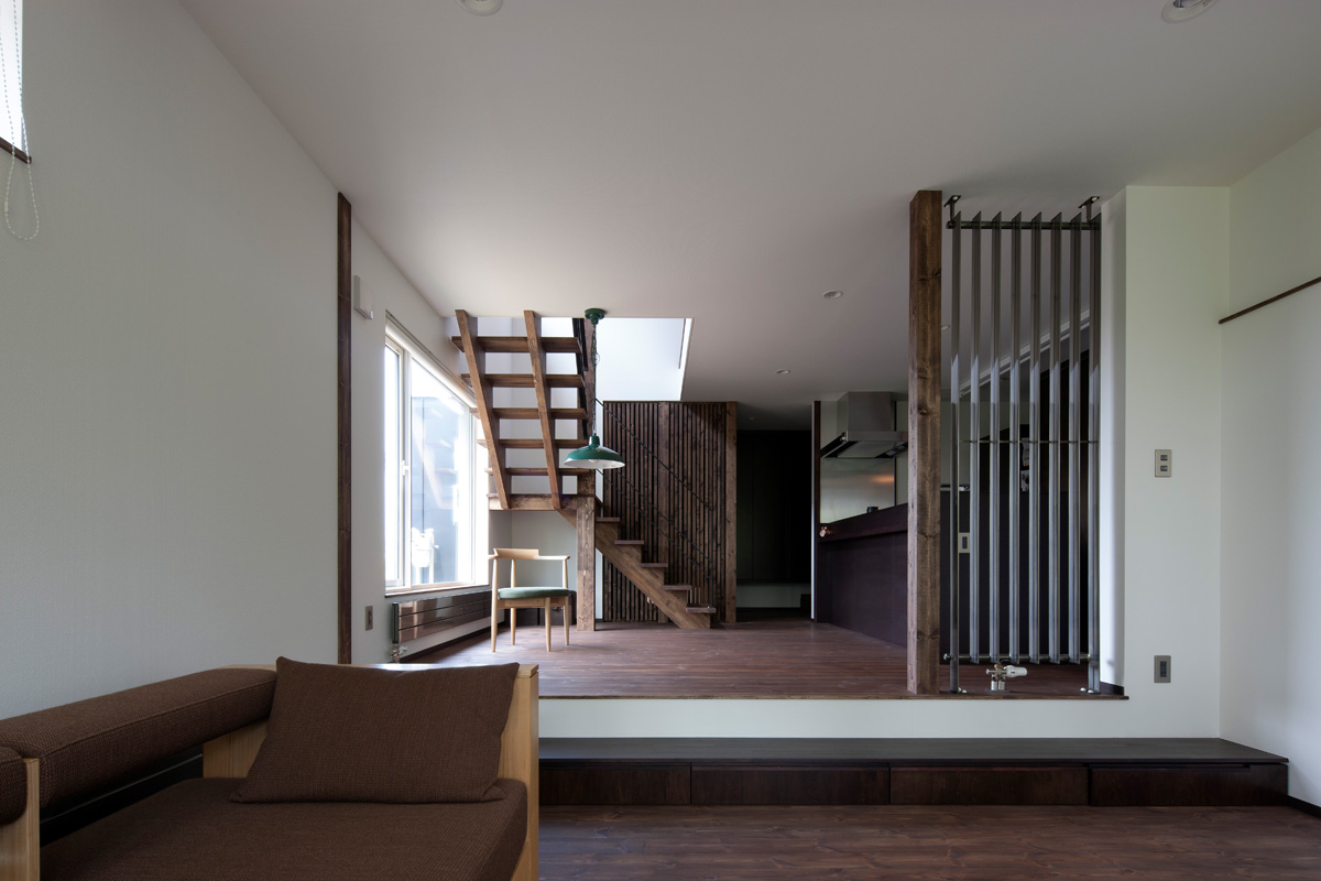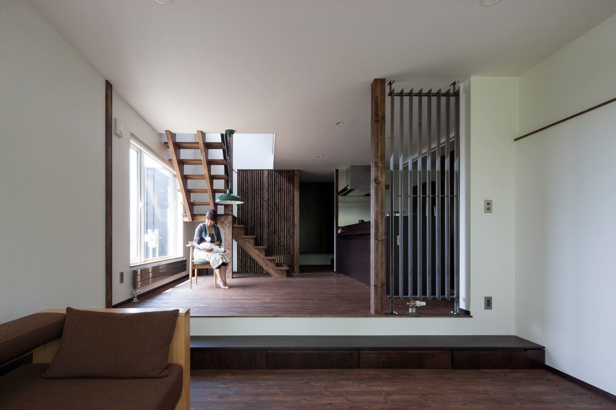 さらに、緑に近いリビングの床を下げ、ダイニングから屋外まで、視線の抜け道を通す。