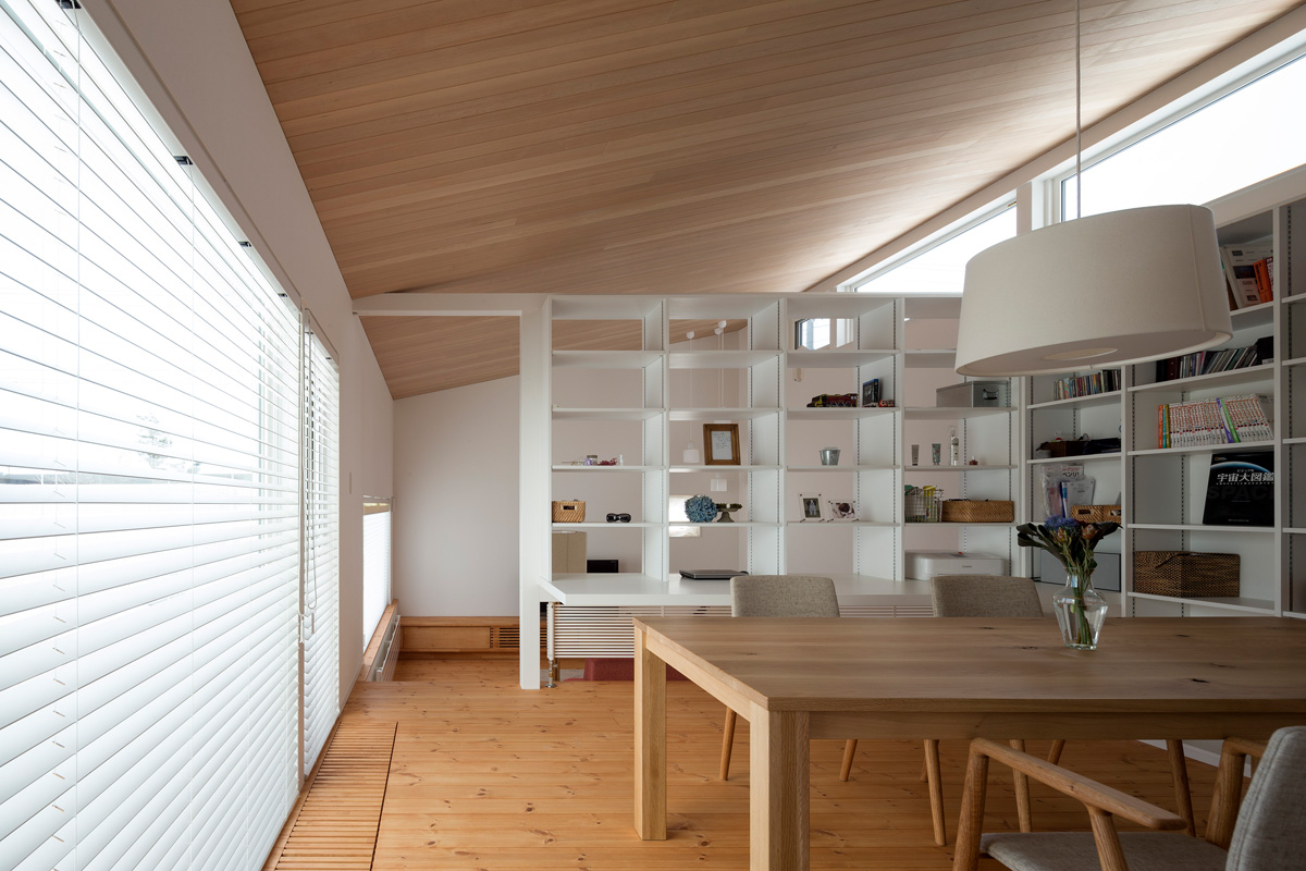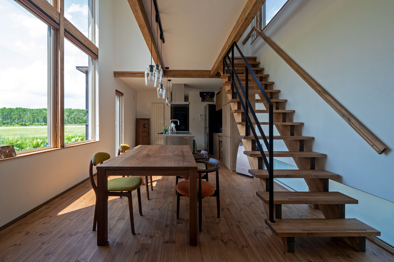 敷地は主要道から雑木林を隔てて、 広大な牧草地と林を眼前に臨む場所です。 牧草地を臨む景観を生かし、そこに開放的な平面をつくること、 その景色は家の中からのみの特別な景観になるように演出すること。