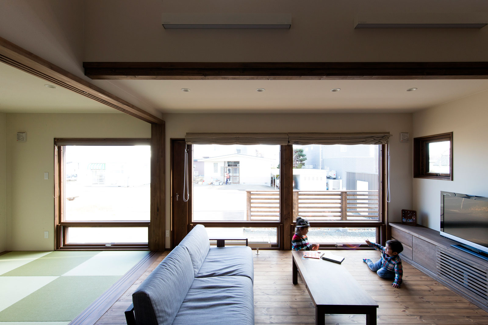 木陰の家 北面は木の陰に隠れ、南面には大きな窓を全面に、 リビングを吹き抜ける開放感と大きな窓から差し込む日差し。 窓には木製窓を使用し、圧倒的な存在感がある中にも気密性にも配慮を。 家全体から木を感じられる家。