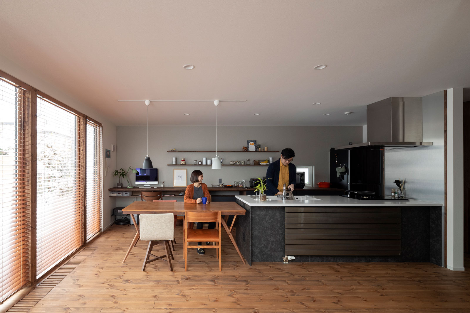 遠い場所に住んでいるご両親を迎え入れ、 共に時間を過ごしたいという思いから計画された共有型の2世帯住宅 玄関、LDK、トイレ、お風呂、などを共有することで、 1部屋1部屋がゆったりとした空間を獲得できる。 そして、みんなが集えるダイニングスペースを中心に、 全ての部屋が繋がりながらもプライベートは確保する。 そんな間取りの構成が、この家の特徴です。