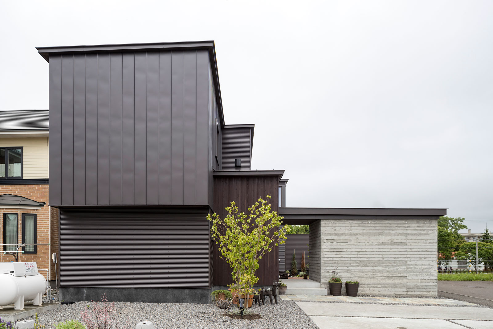 勇払の住宅街に立つコートテラスを備える家。開かれた角地での計画の中で、程よく近隣との距離を保つコートテラスを用いた。このことが外部からの視線を低減させ、常時テラスに向かって開放的な暮らしを実現する。