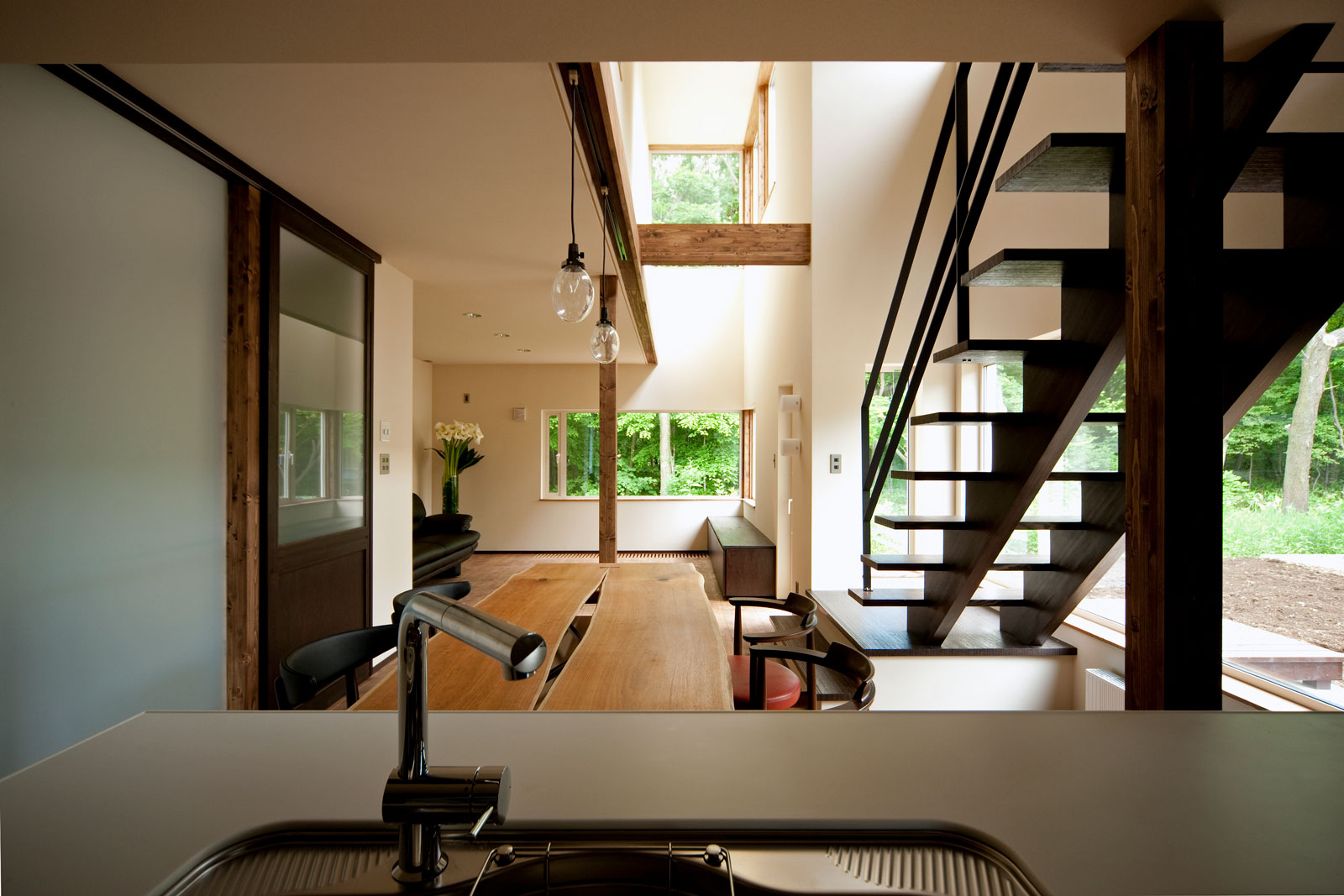 家にあるすべての窓からは生き生きとした緑が顔を出し、 リビングから上る階段の延長上にはフリースペースを設け、 階数の違う空間に繋がりをもたせた。 外と内・1階と2階のそれぞれ目的の異なる空間が、 すべて繋がる。