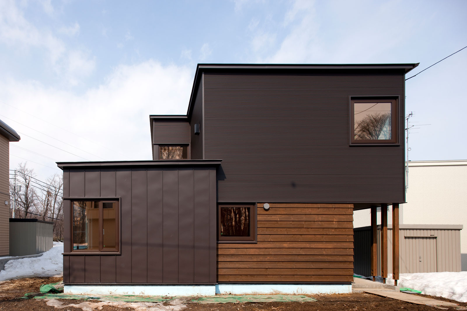 大自然が寄り添う千歳市みどり台の敷地。 「涼」のオーナー様と弊社には大切な繋がりがある。 オーナー様のご実家は弊社住宅。 4年間、家族の住まいを見続けて、自ら叶え構えた器は「涼(りょう)」。
