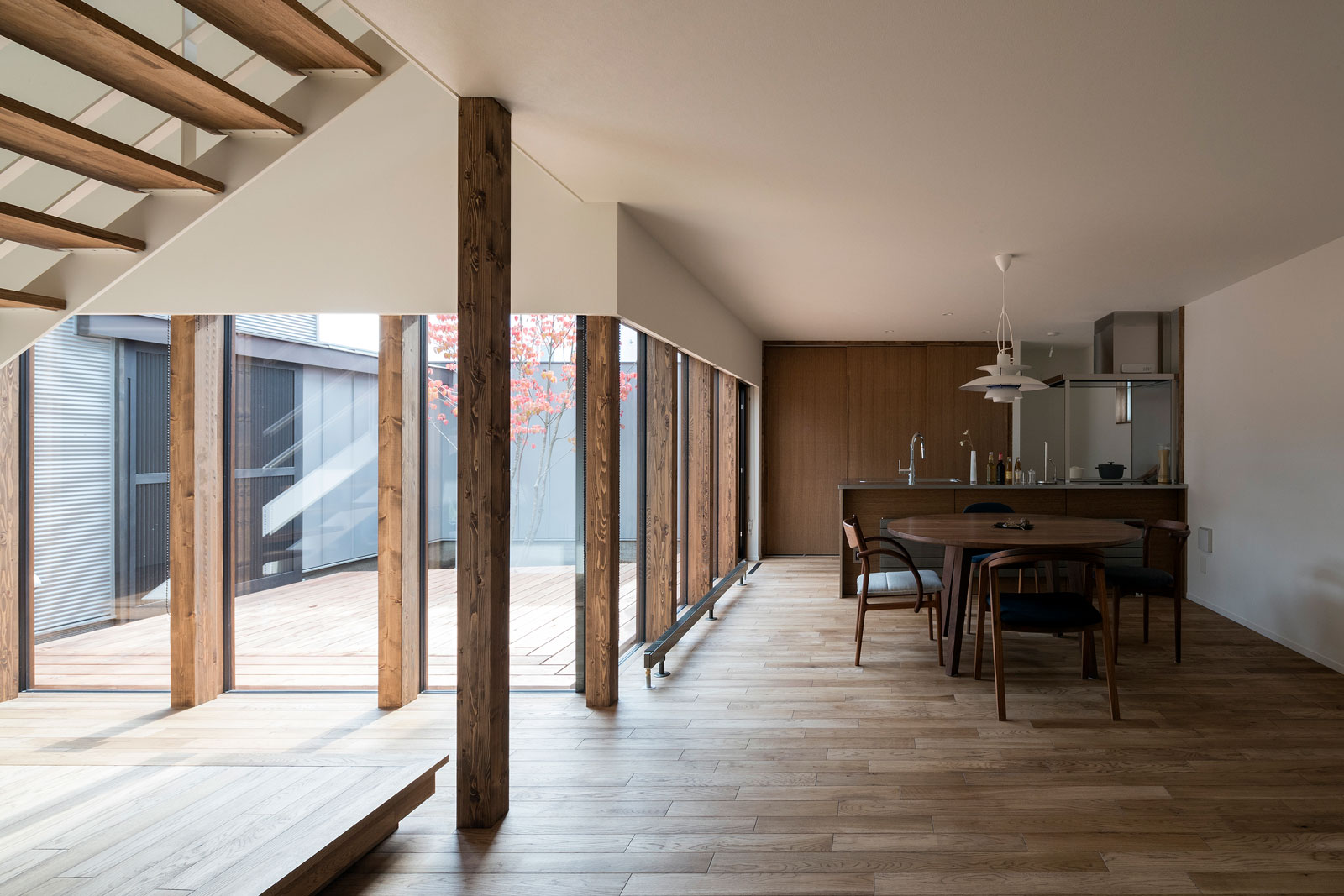ガラスのカーテンウォール越しに眺める広い中庭。ウッドデッキを1階の床と同じ高さにすることで、屋外と屋内が一体化したような空間の広がりが感じられる。
