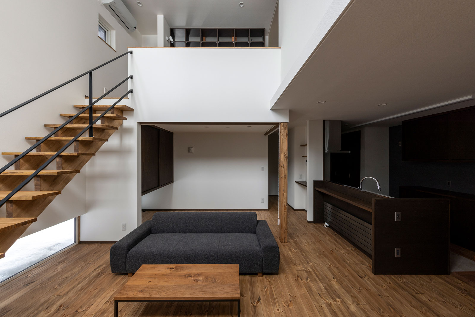 重量木骨の家の事例です。敷地の環境から取り入れにくかった採光は、 大きな吹抜け窓を設けたことにより光が伸び、 書斎とフリースペースに降り注ぐ。