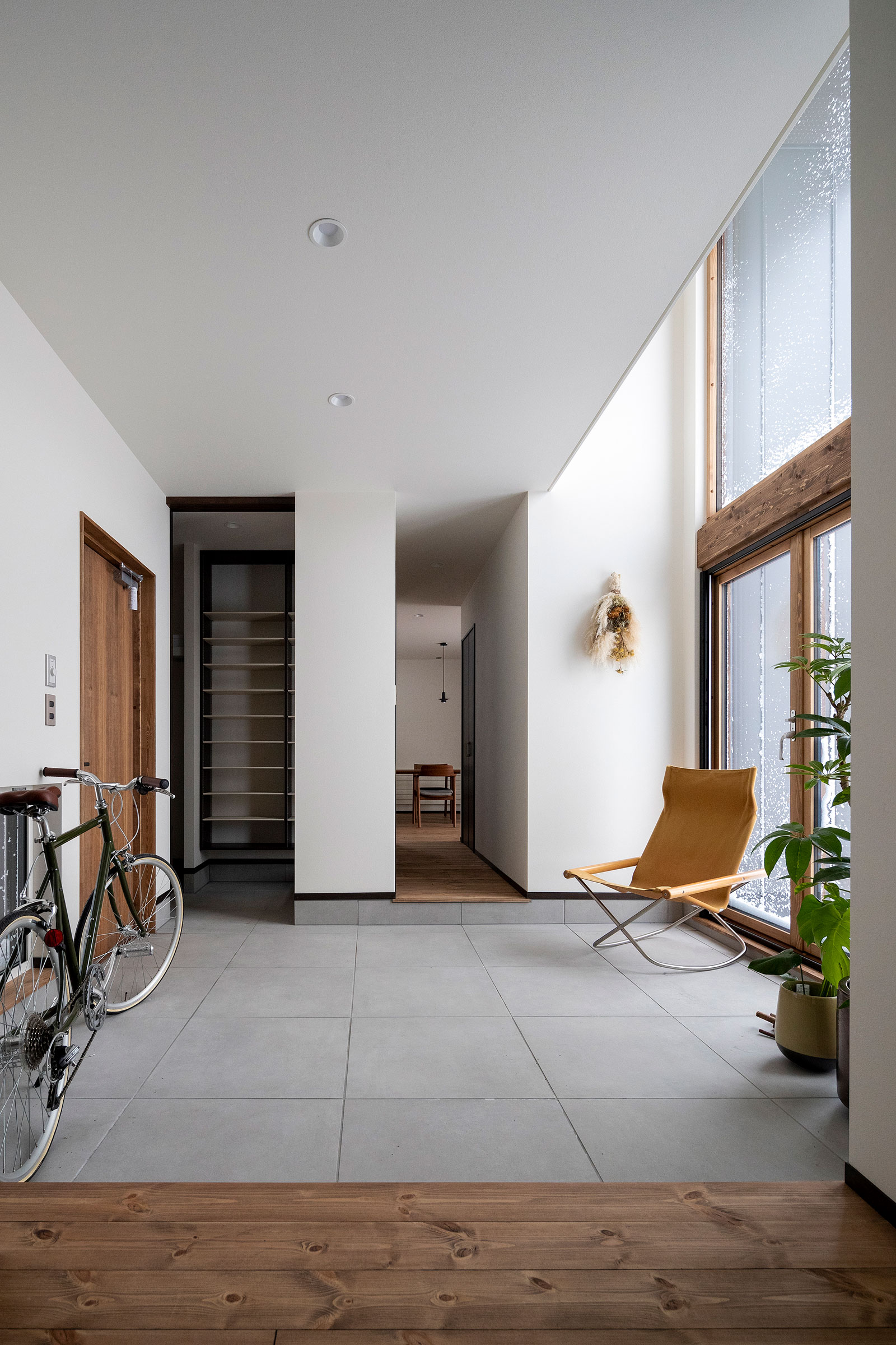 大きな窓や土間のある生活。 リビングやダイニングと隣り合ったこの場所は 一段の境界で緩やかに区切られている。