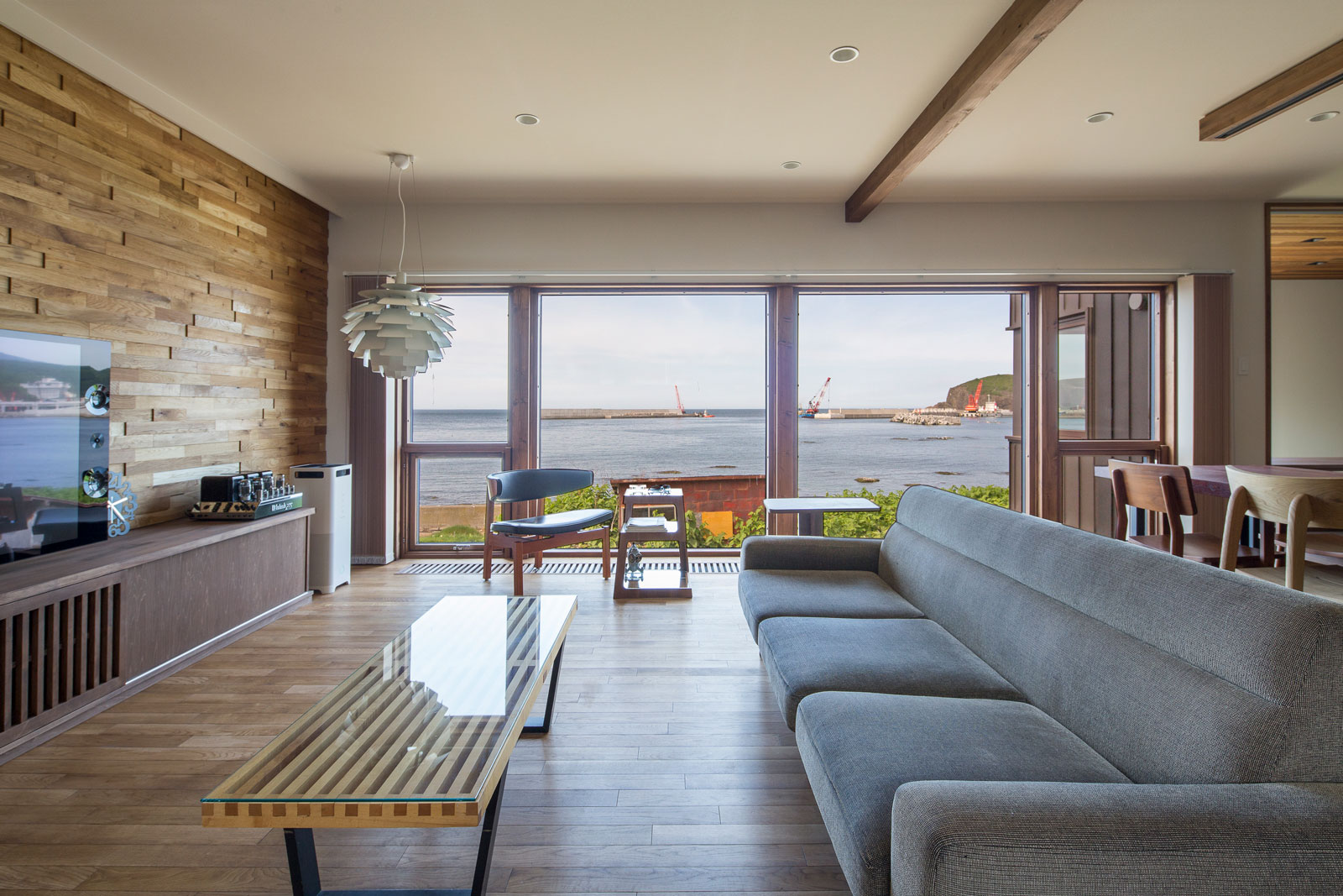 世界遺産、知床の港を望む場所に建つ海沿いの家。 いつか家を建てたときの為に集めていた家具や照明器具たちが、 窓から見える景色やいろいろな素材を使った壁や天井と馴染んで ずっと前からその場所にあるような家。 いつかテラスを作りたいと話すオーナー様。