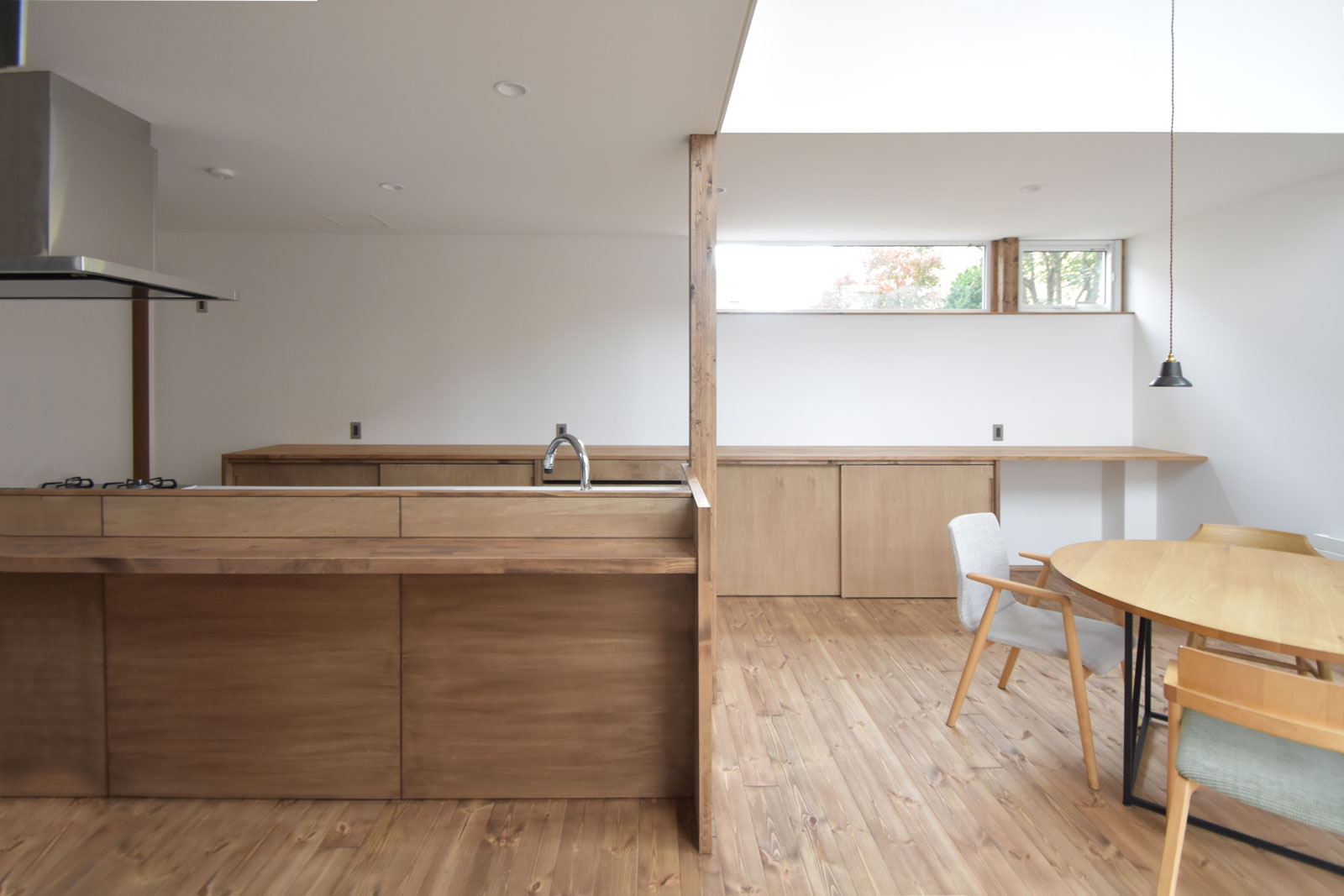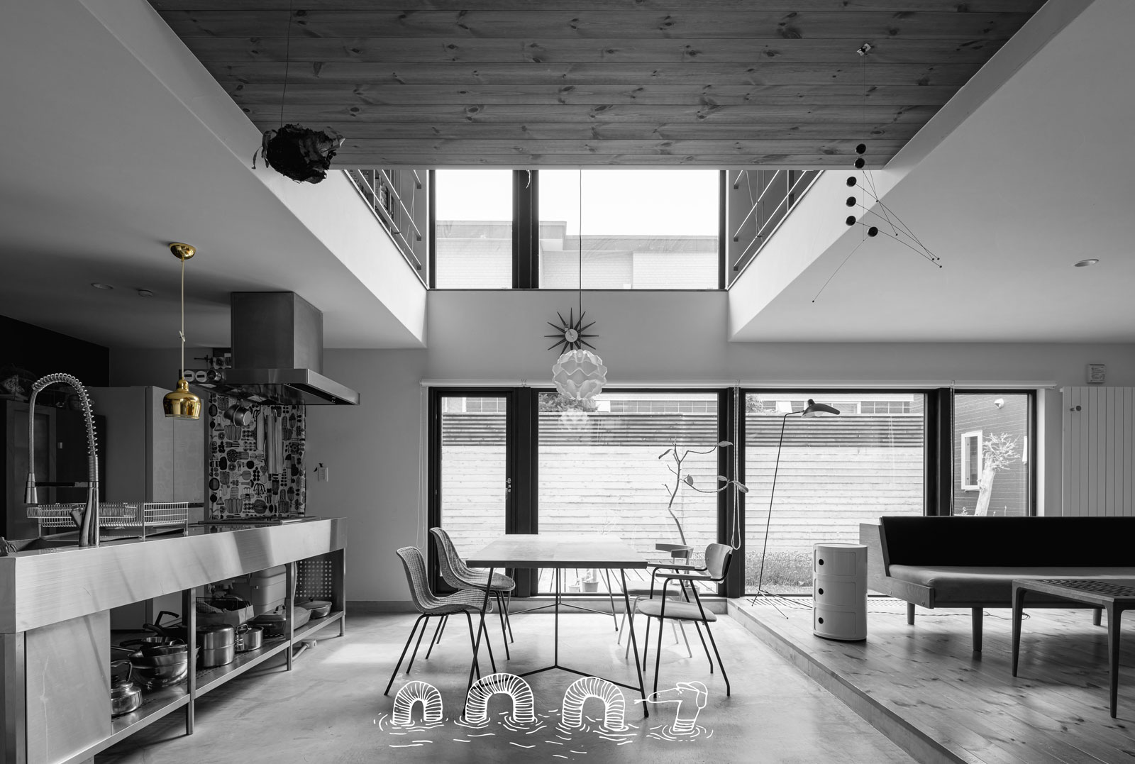 吹き抜けた土間が家の中心に拡がる。 無機質なステンレスのキッチンと鉄骨階段。 境界線のない空間で気の向くままに時を過ごす。 あいまいに使うことで家が楽しくなる。