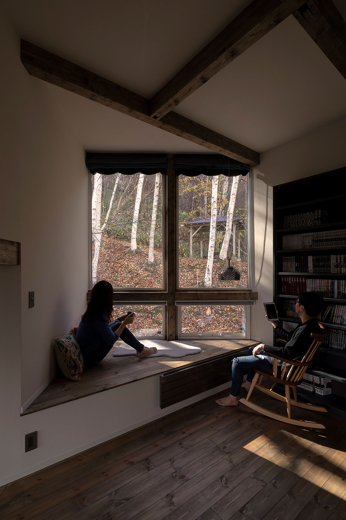 窓辺にもたれかかって眺める山の樹々。 陽の光で刻まれてゆく秒針で暮らしは彩られる。 東の空が明るくなる、この僅かな時間が大好きなんだ。 ボクたちは、この日常の何気ない風景が大好きなんだ。 窓の外の風景は、暦のように四季を映し出してくれるからね。