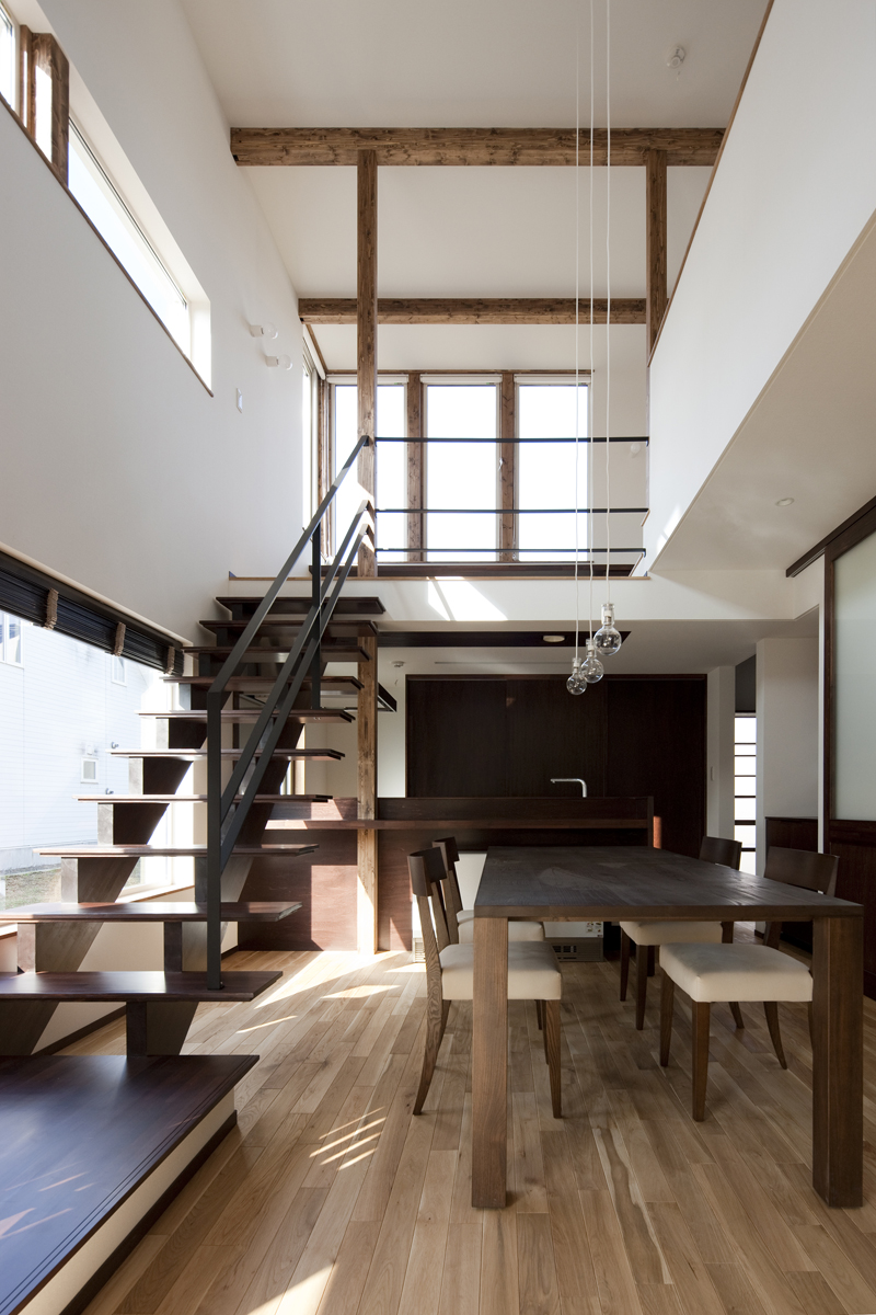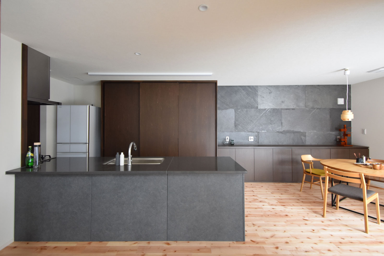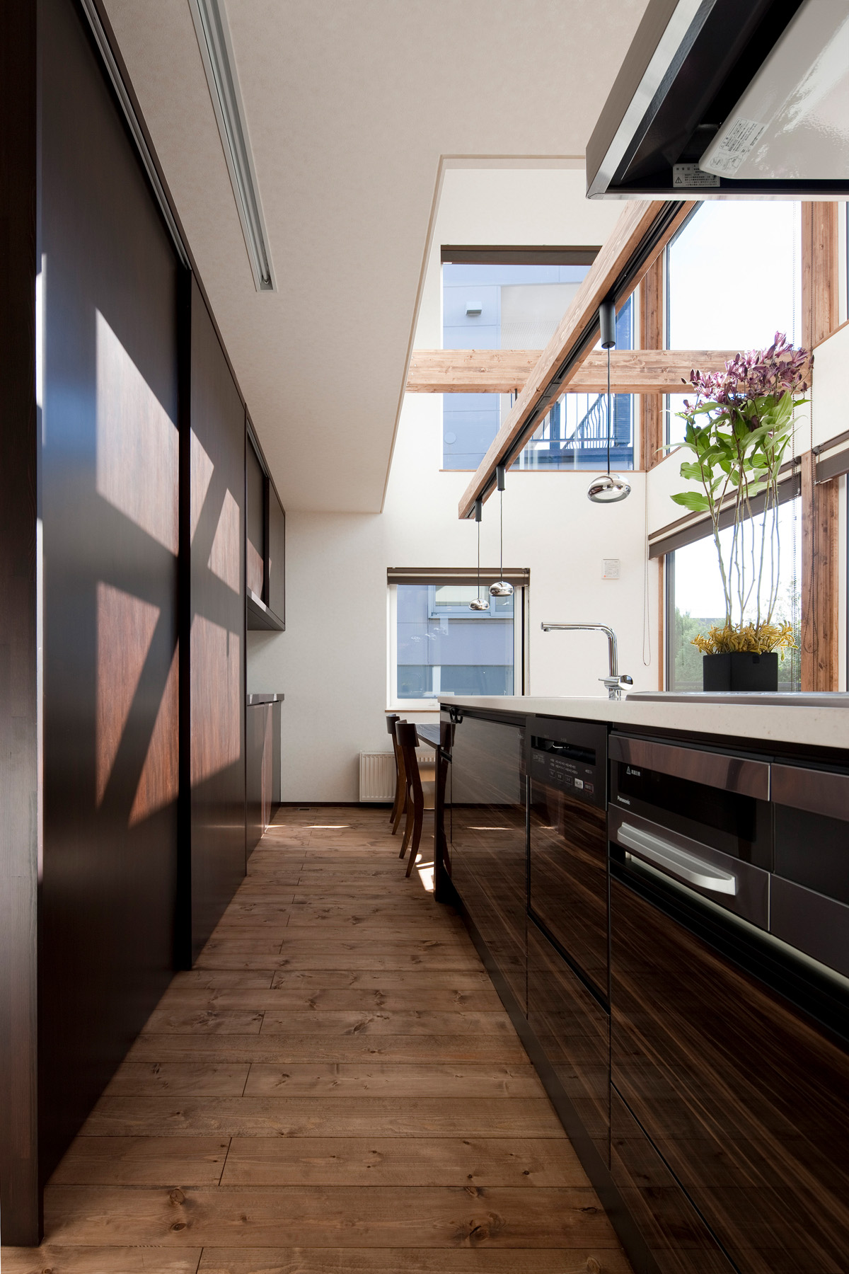 札幌市の住宅街に建つ片流れ屋根の家。 シンプルにすることで、壁には好きなモノを。 床はシルバーチェリー材。 経年変化を愉しみ 器として家族と共に成長していくだろう。