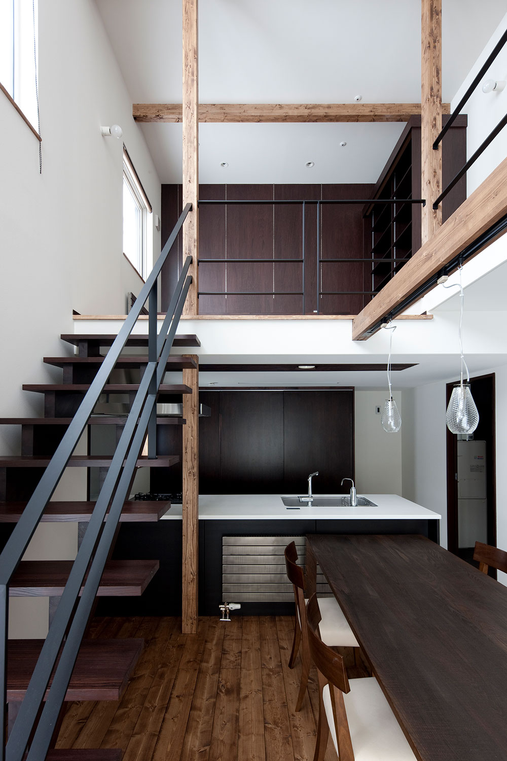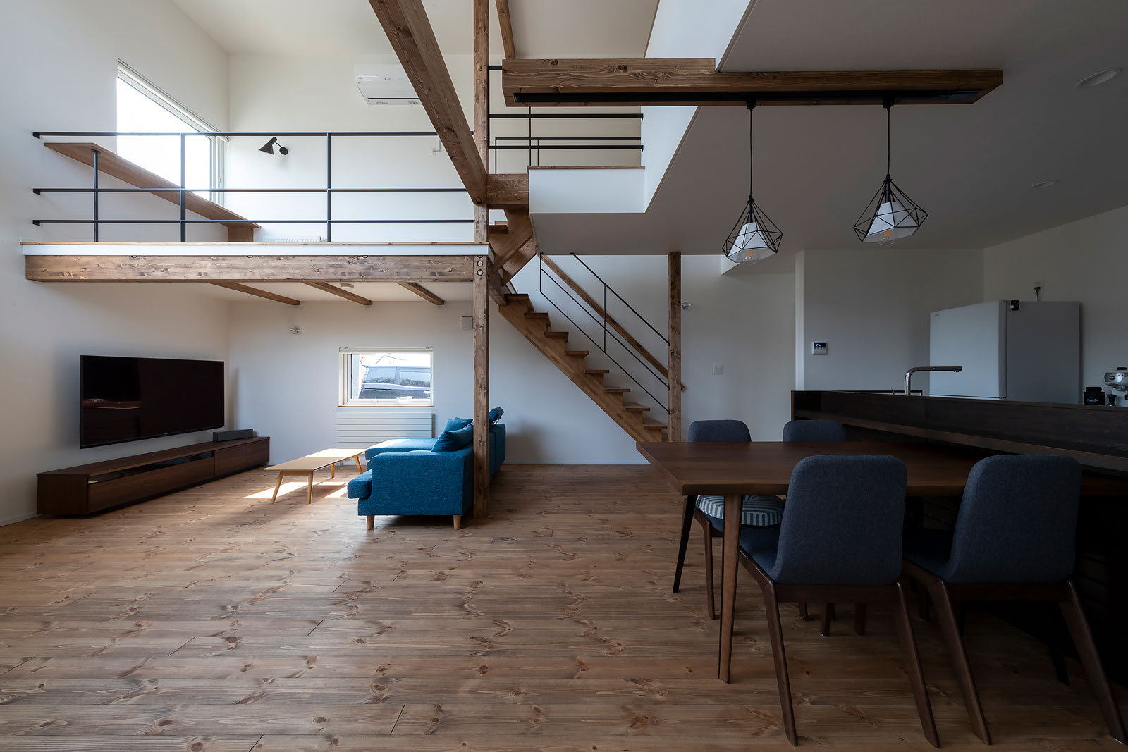 アイランドキッチンをメインとした広いLDK は、 平屋でありながらリビング上部が 吹抜けになっており、 沢山の日差しが入り込む 明るい空間を作り出します。