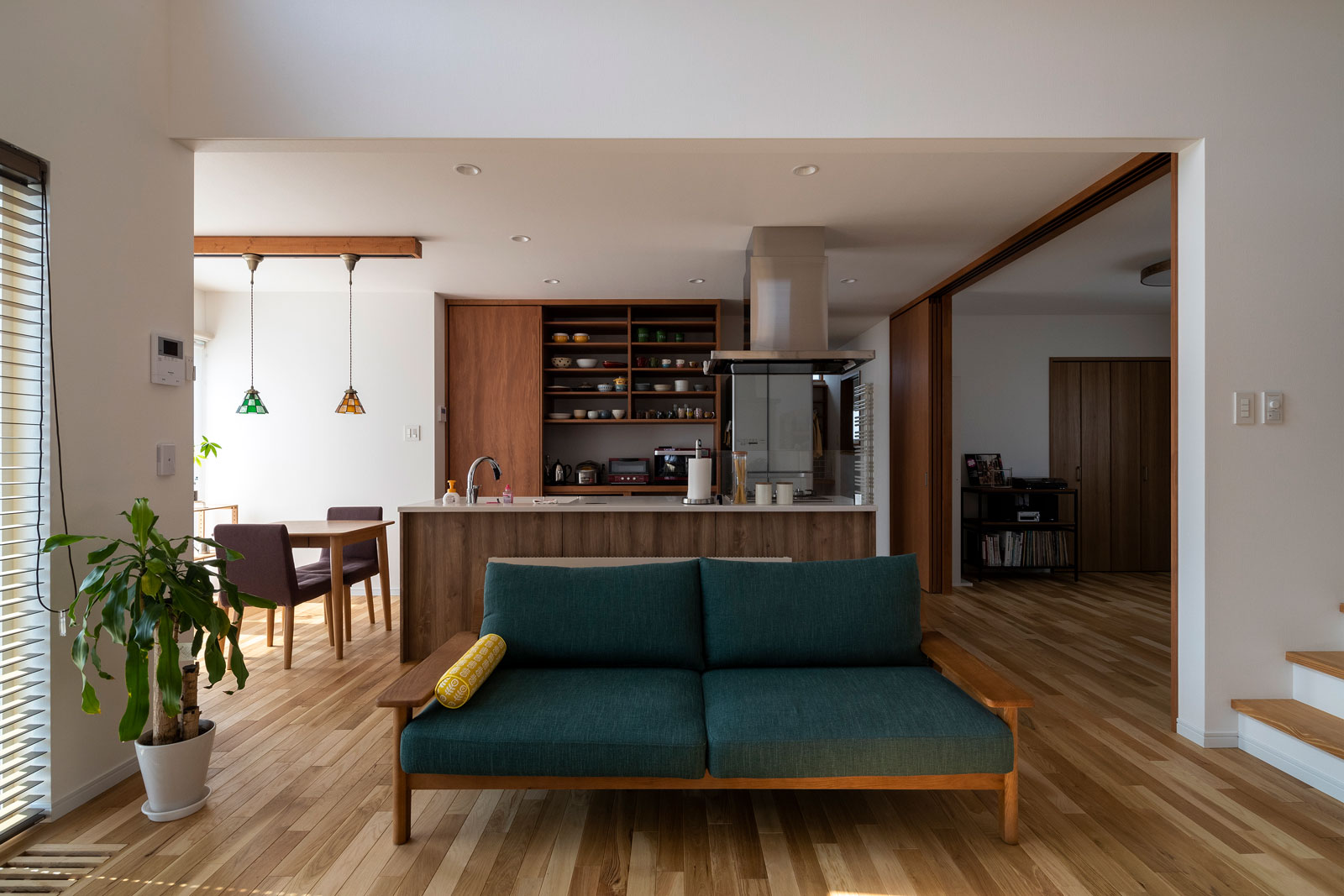 玄関で迎えるのは、 柔らかな日差しに向くひまわりの「藍」。 雑貨や家具をどこに置くか、どこで読書を楽しむか、 家族のこれからの暮らしを場面ごとに想像した。