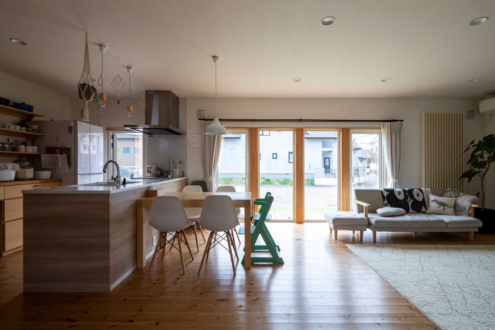 家族みんなで、ゆっくり楽しく暮らせる家がいい。 広い敷地で子供たちを思う存分遊ばせてあげたい。 陽の沢山あたる、明るくて暖かいリビングで日向ぼっこしながら、 優しくてやわらかい無垢の床で昼寝する子供達。 沢山の思いが詰まった居心地のいい家。