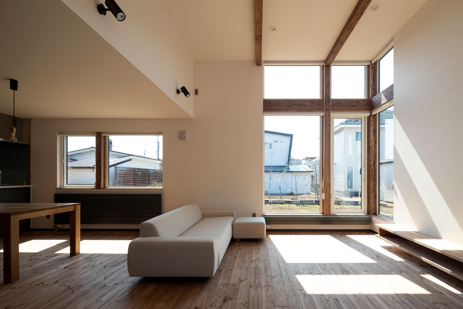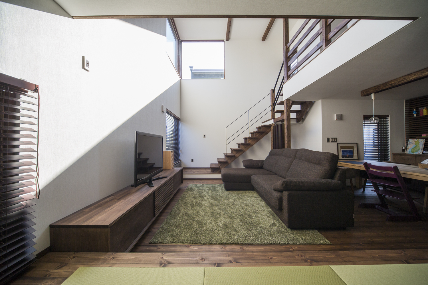 一段高い小上がりに腰掛けると、リビングとL字形の関係性が生まれる。 普段使いできる小上がりはダイニングやキッチンからもコミュニケーションがしやすい。 さらにリビングの吹き抜けが2階のフリースペースまで緩やかにつないでゆく。 程良い距離感の中で、視線が抜けたり留まったり。