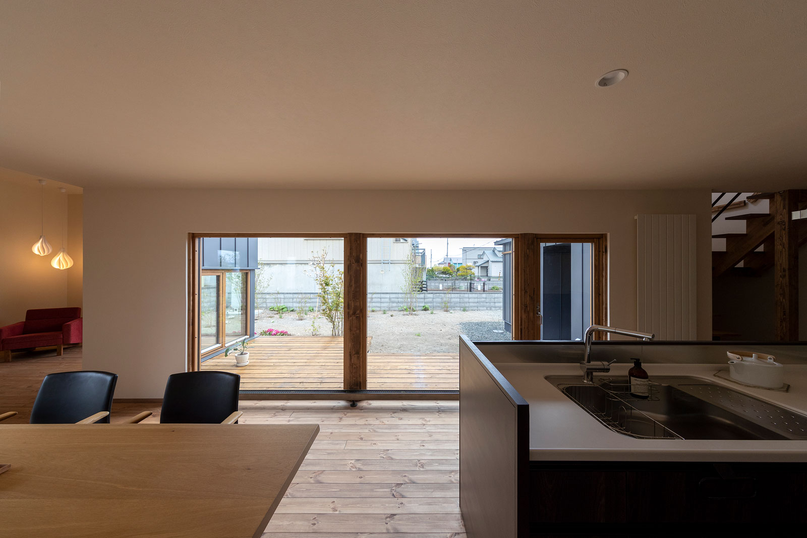 ガラスのカーテンウォール越しに眺める広い中庭。ウッドデッキを1階の床と同じ高さにすることで、屋外と屋内が一体化したような空間の広がりが感じられる。