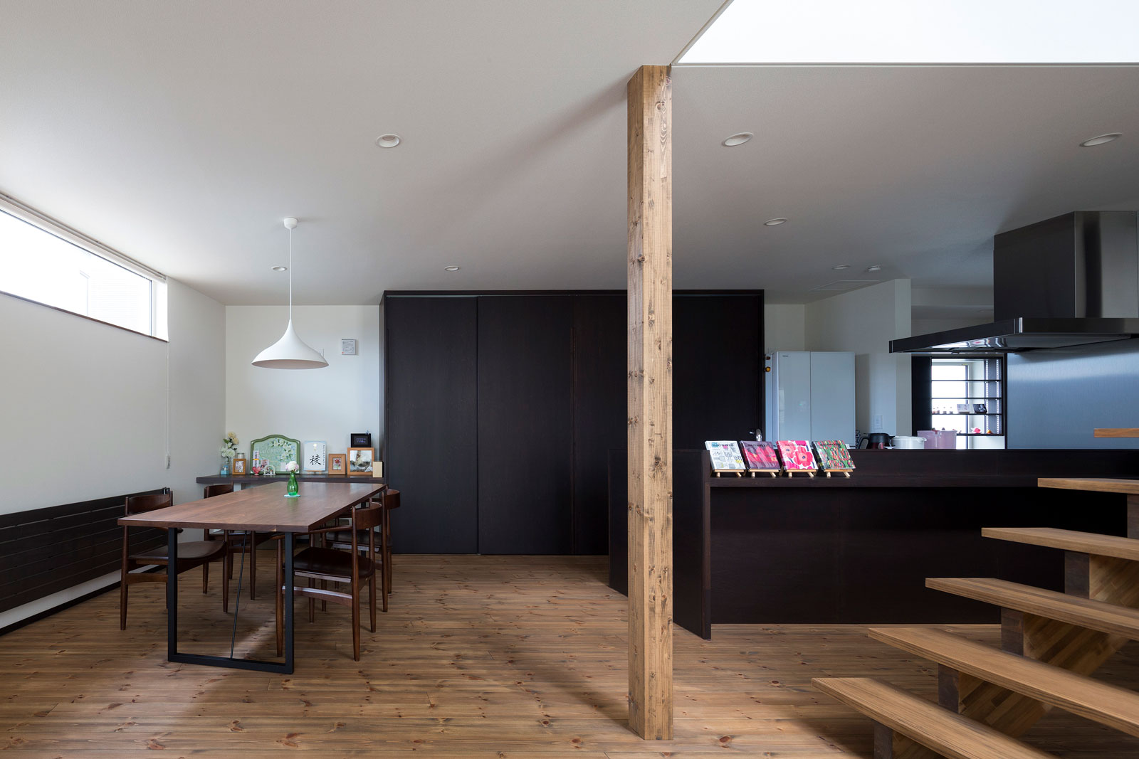 キッチンからは、コの字型に囲われた小さな庭が階段越しに見える。 ダイニングからは、扇形に広がる斜めの壁を背にすることで、より広がりを感じる。 リビングからは、木サッシ越しに見える庭、吹き抜けから階段へ降り注ぐ光、 そしてキッチンとダイニングにいる家族が自然と視界に入ってくる。 ⼀番⻑い時間を過ごす空間にゆとりを持たせ、それぞれの場所との繋がりを意識し、 「斜め」を意図的に作ることで、曖昧さから生まれる豊かさに期待をした。