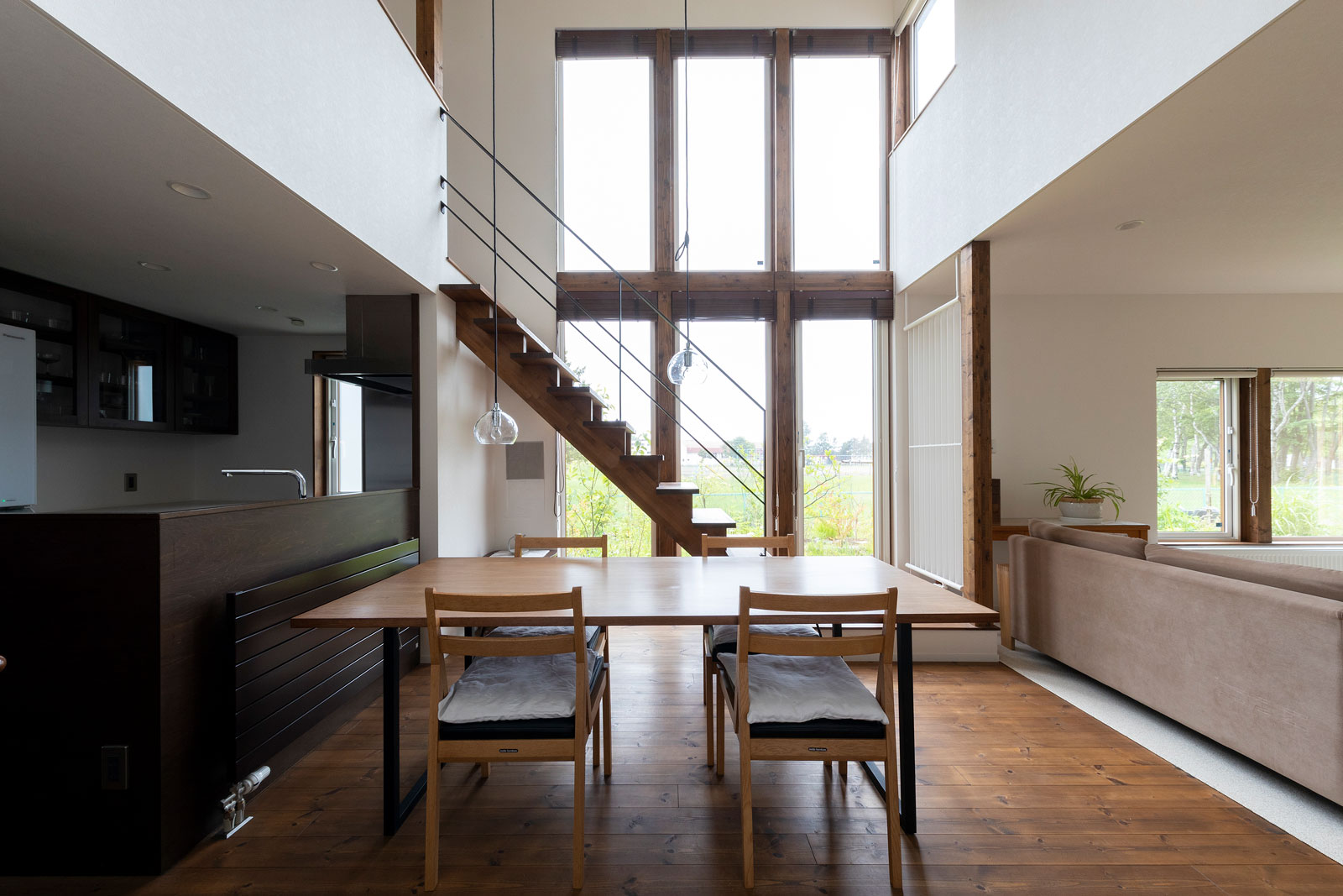 拓勇に建つ6面窓の家。 遊歩道沿いの樹木を眺めながら住まう為、この場所に建てられた家。 「周囲のロケーションと共存した暮らし」それが、オーナーの願い。 その願いを、ダイニングが主役のレイアウトで実現した家。 お気に入りの2Mオーバーのテーブルに座ると、6面の窓が周囲の景色を採り入れてくれる。