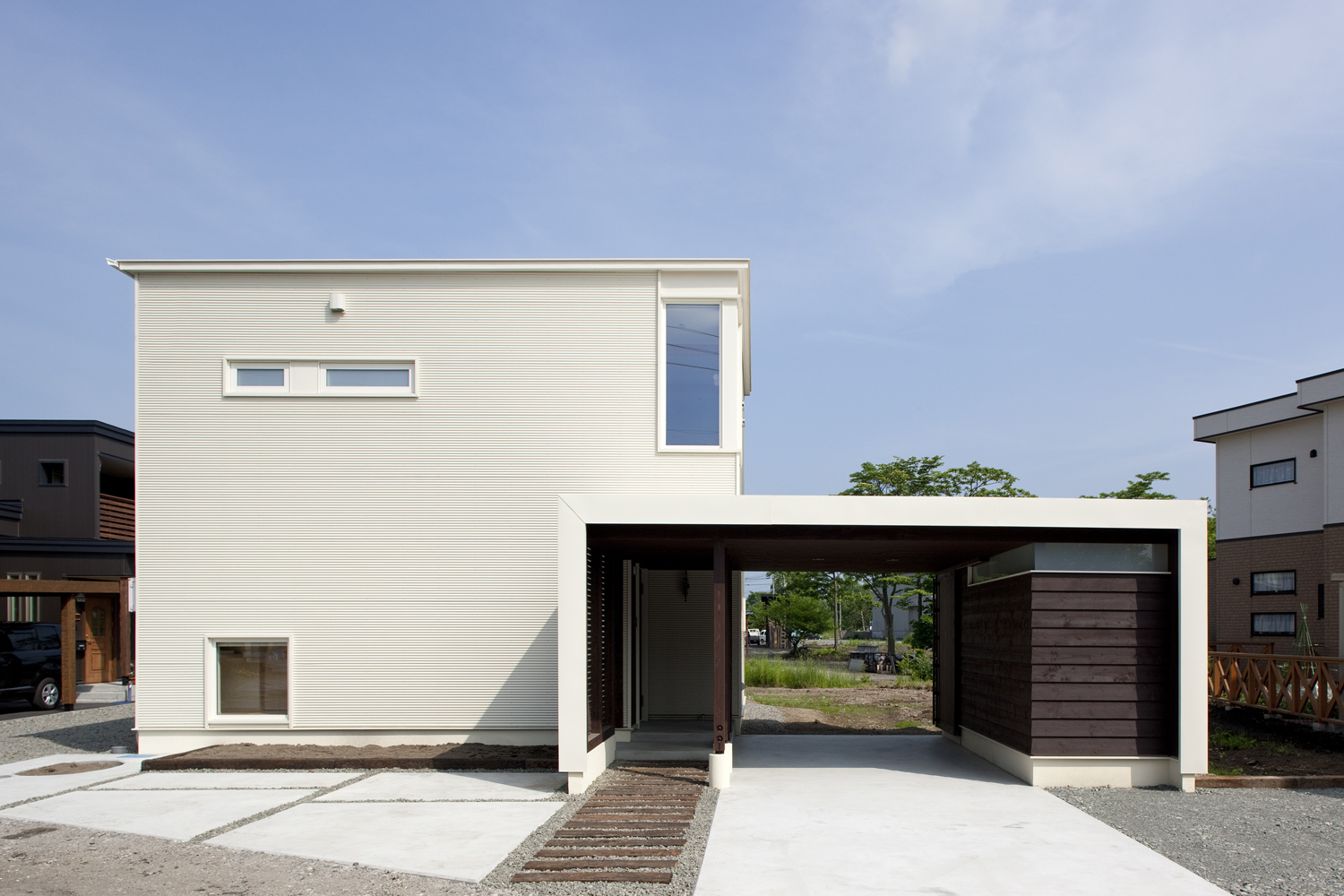 北広島の河川敷沿いに建つ家。 ロケーションの良さにこの土地を購入したオーナー様。 そこには、「屋外でもマイホームを楽しみたい」 そんな要望が込められた家となった。